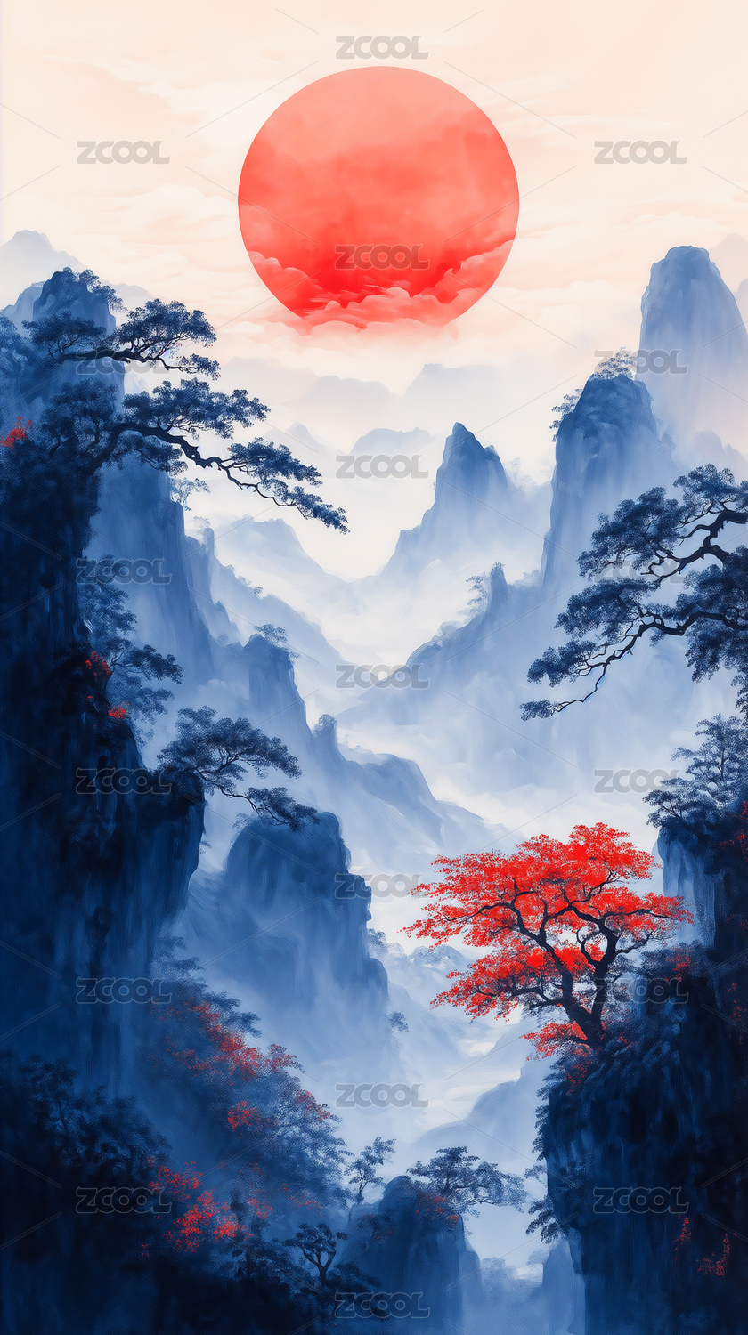 水墨山水与红日