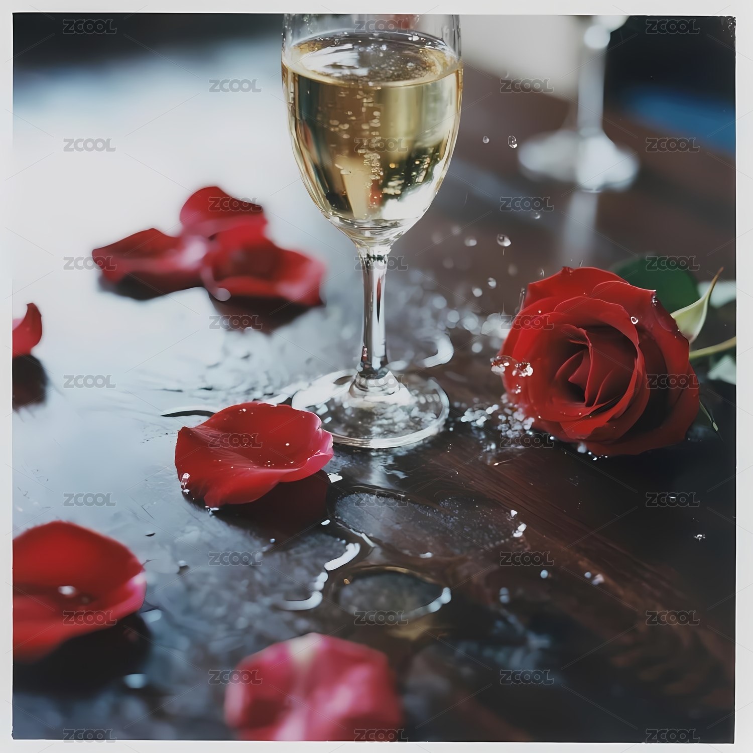 香槟酒杯与玫瑰花瓣的浪漫场景