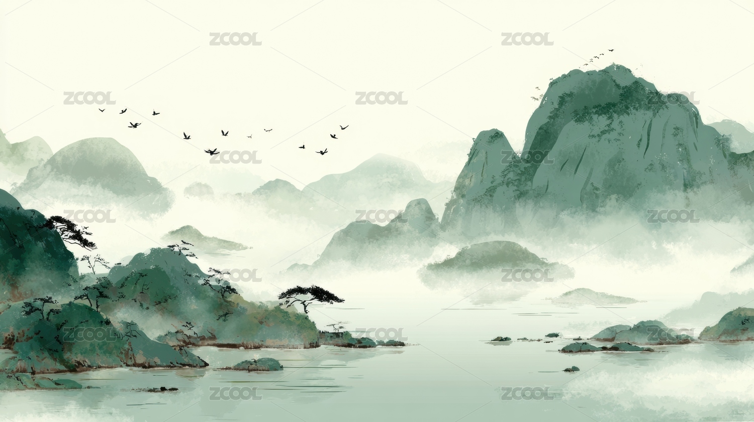 传统,山峦,飞鸟,远山,水面,自然,风景,水墨,淡雅,宁静
