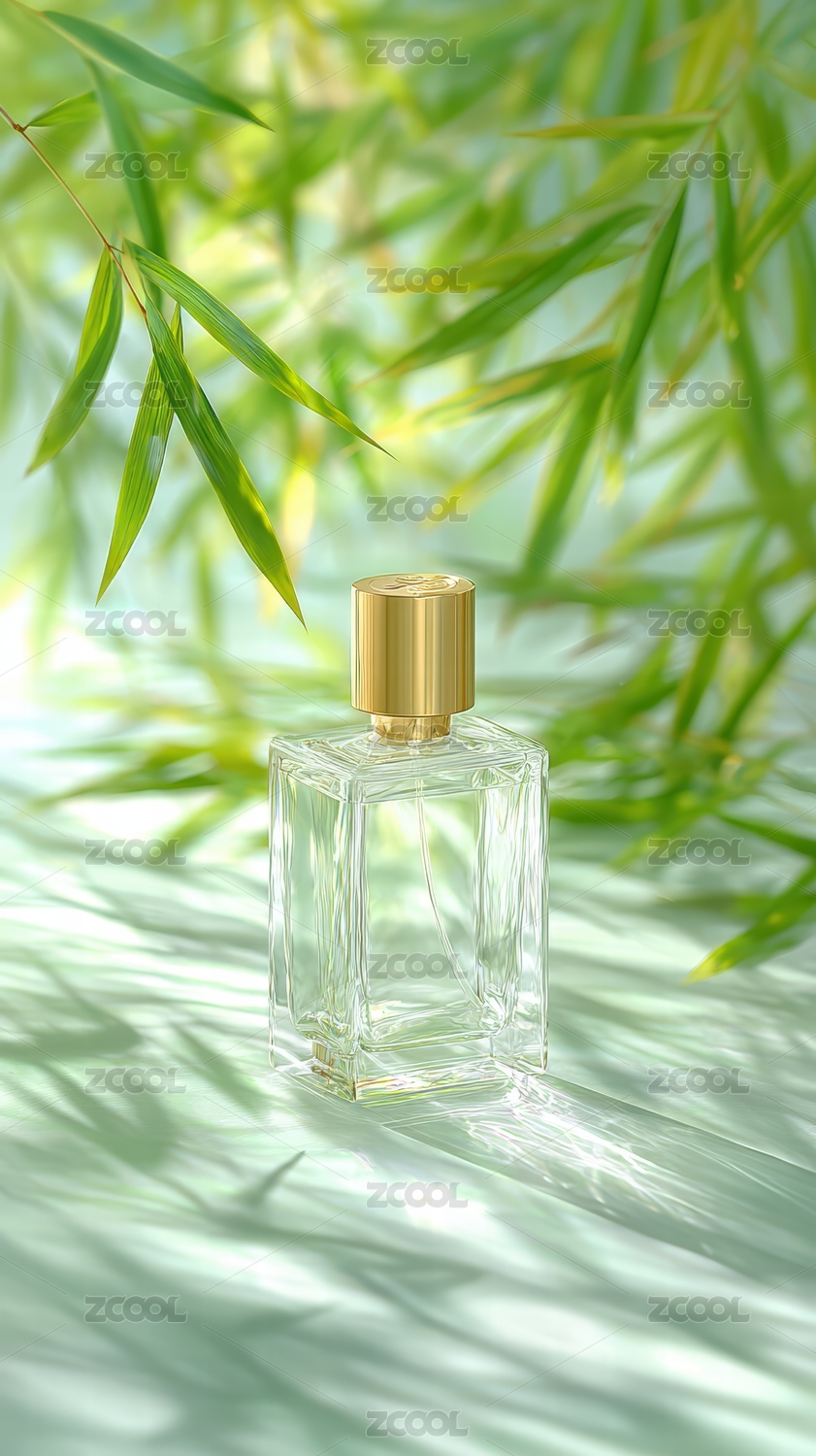 香水瓶与竹叶的清新自然之美