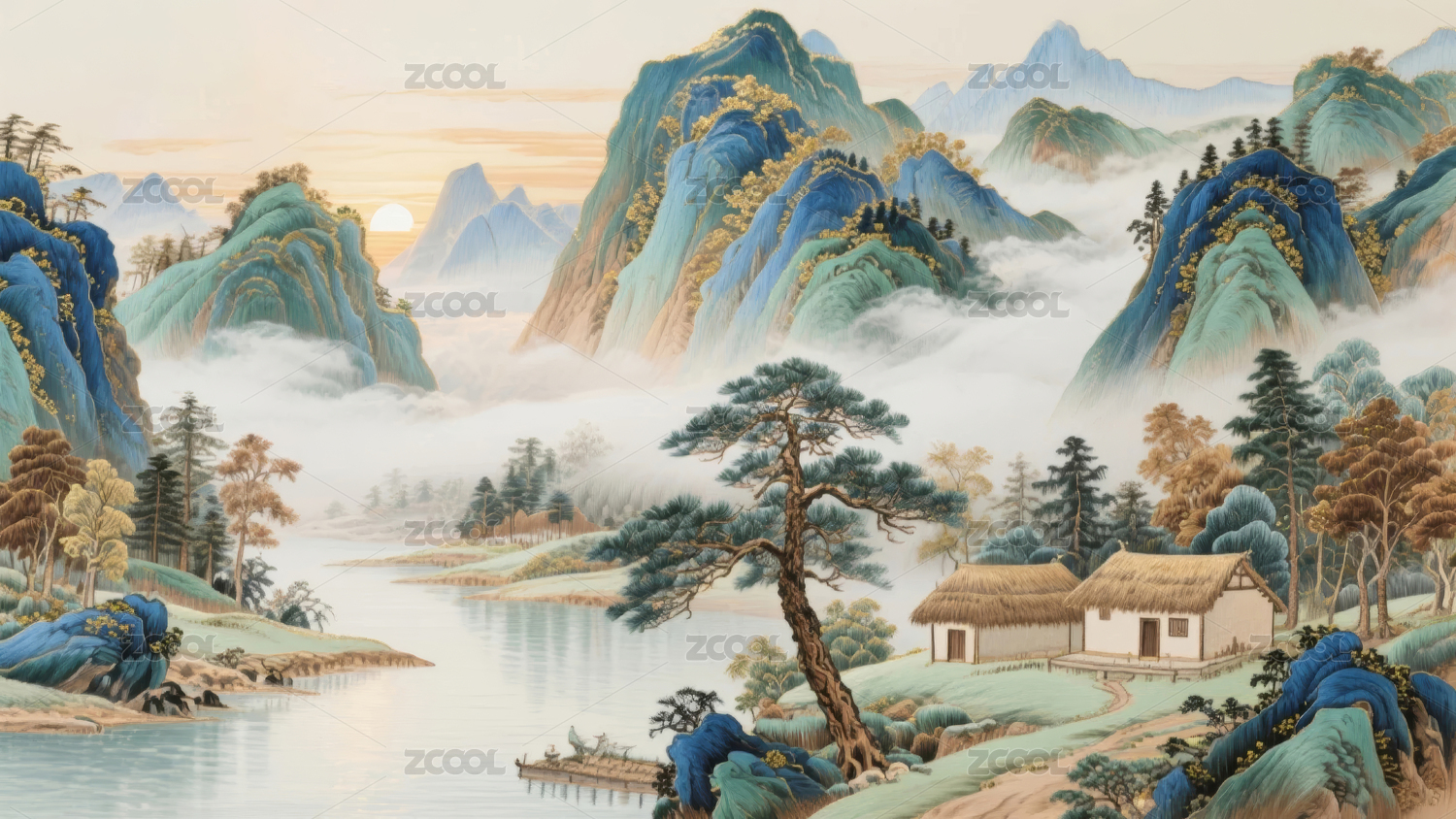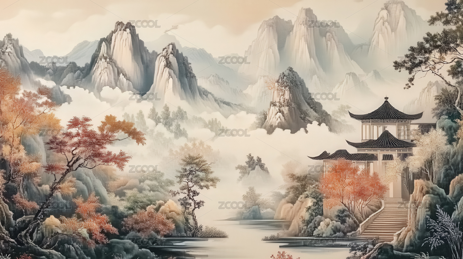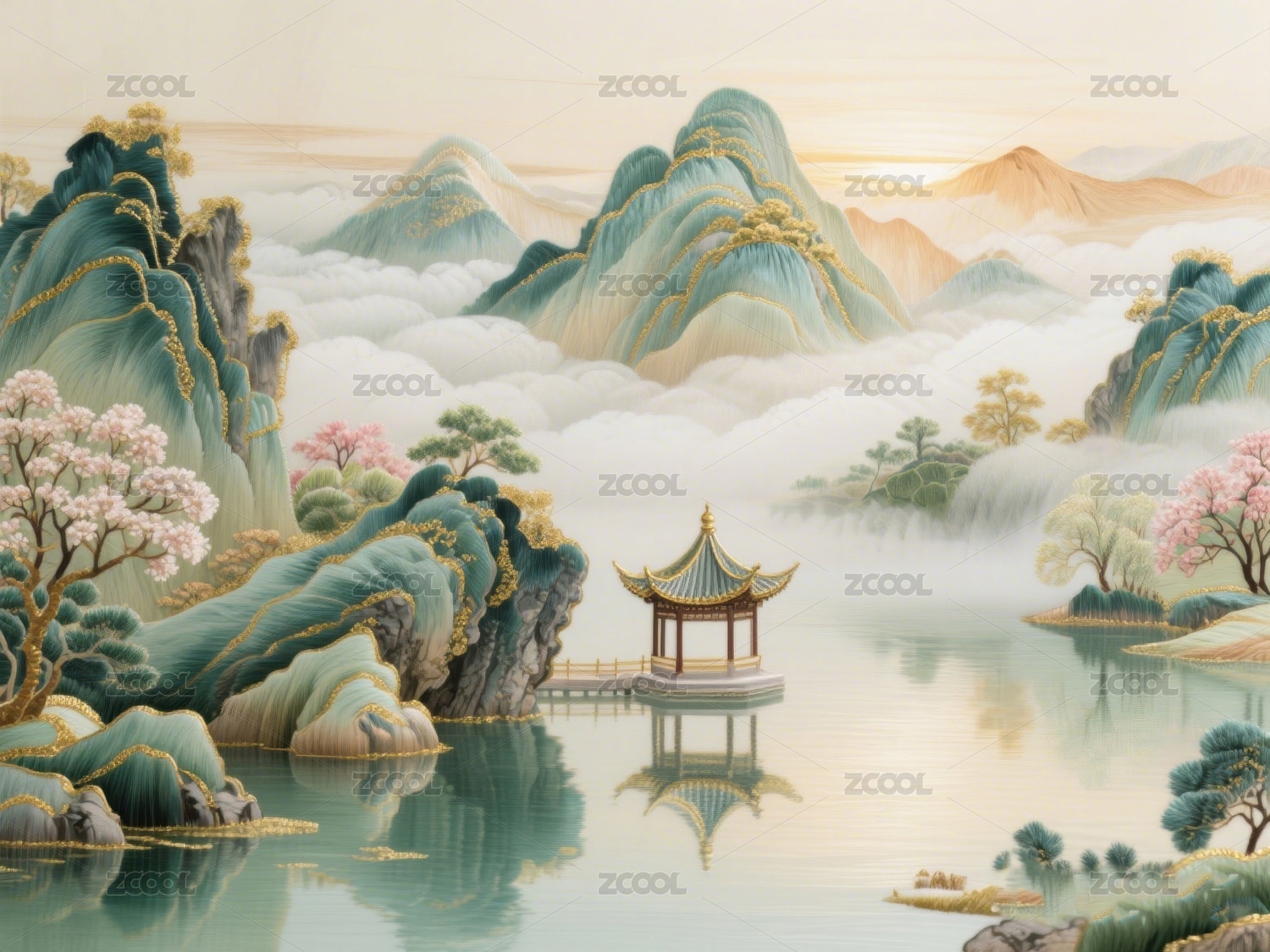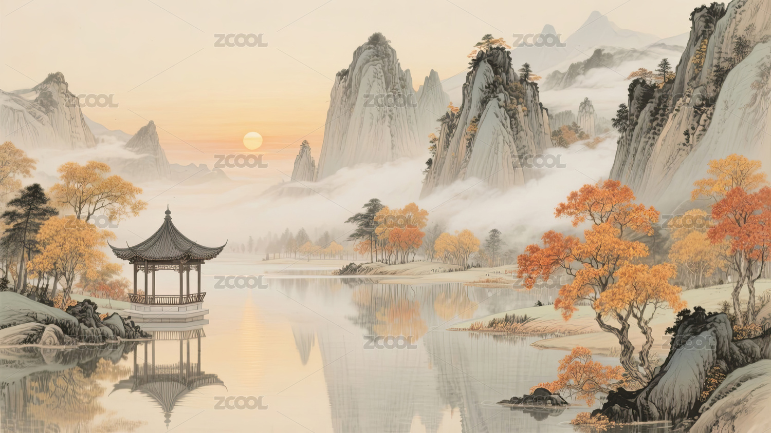 山水,工笔画,亭台,落日,湖泊,倒影,山峦,云雾,树木,传统绘画