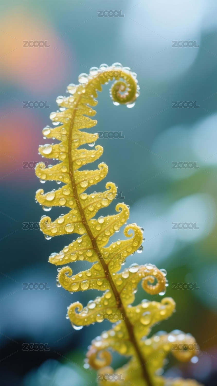 蕨类植物嫩芽水滴特写