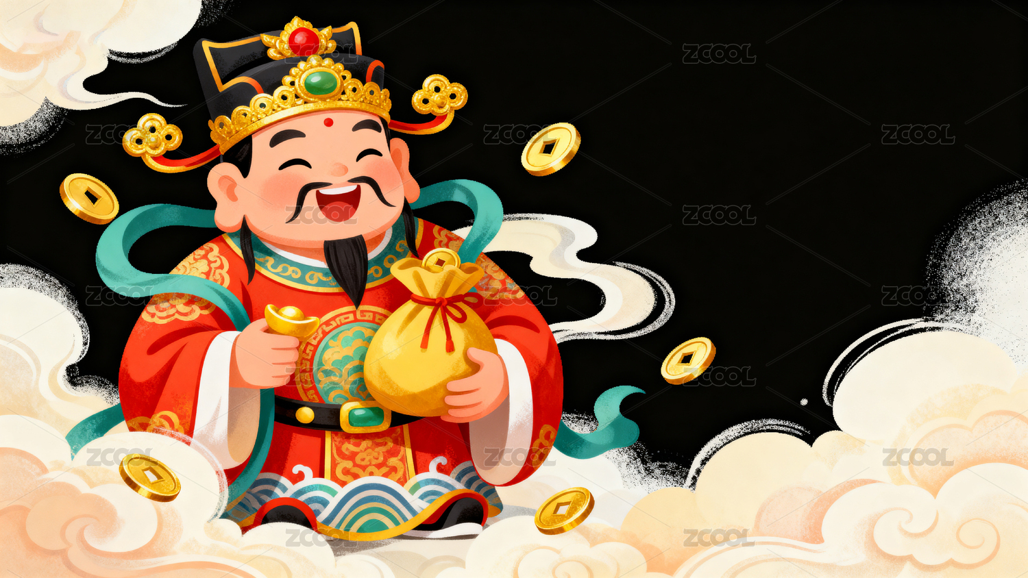 传统,装饰,财神,笑容,胡须,服饰,金色,喜庆,欢乐,黑色