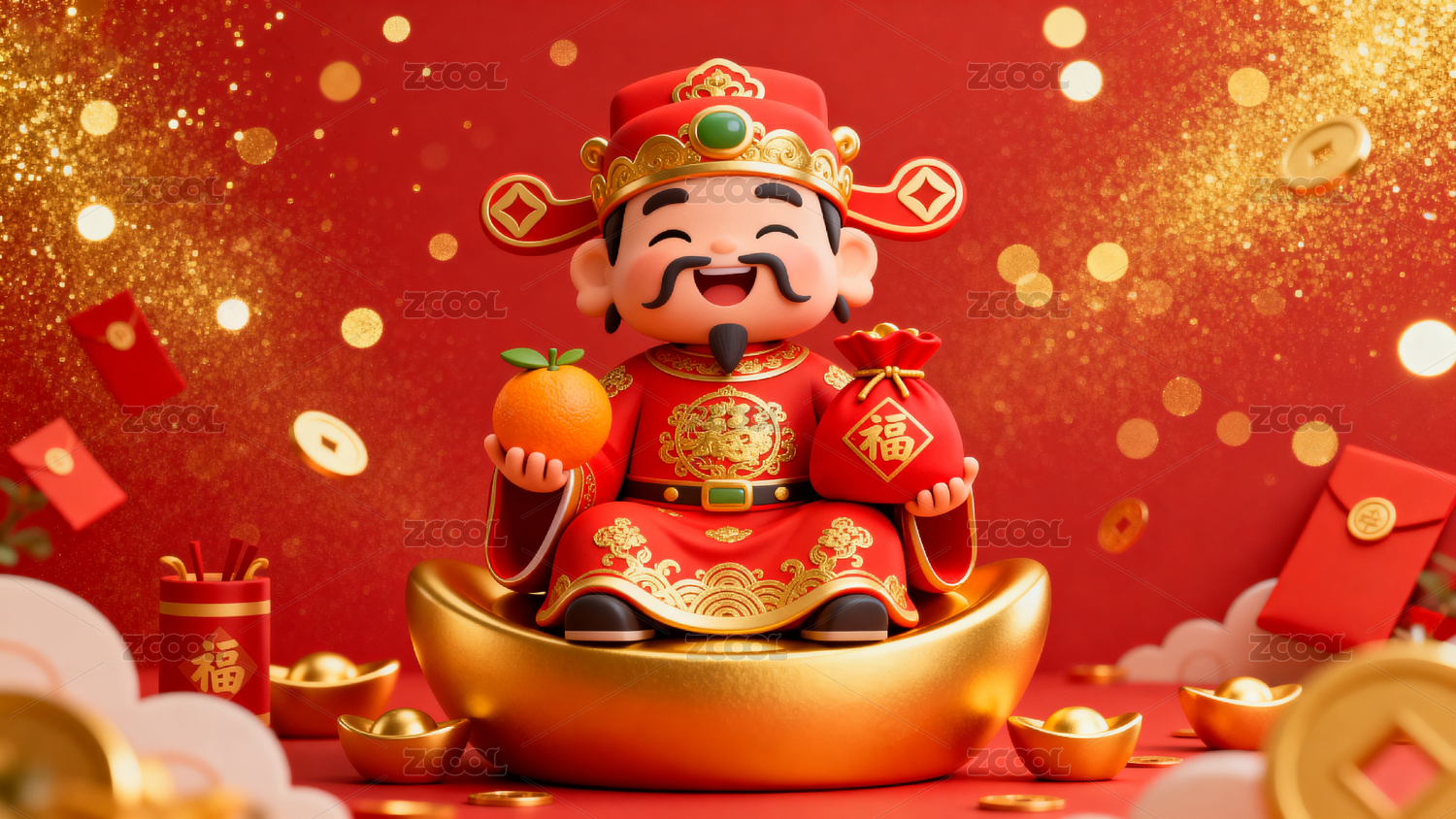 春节财神爷身穿红袍驾云撒元宝
