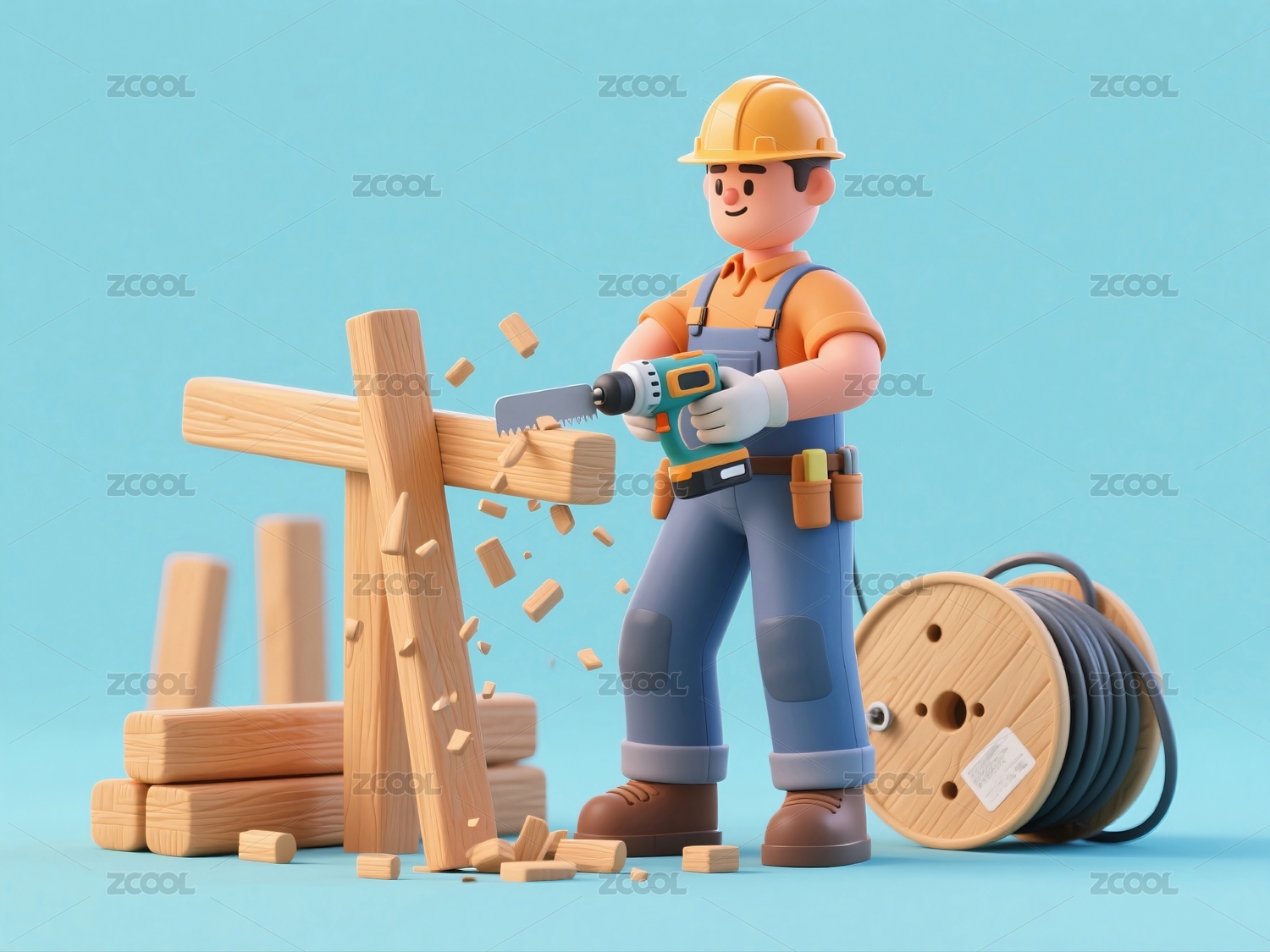 卡通建筑工人切割木材