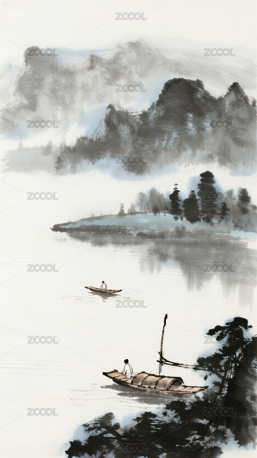 宁静水墨画中的孤帆泊于迷雾岛屿间