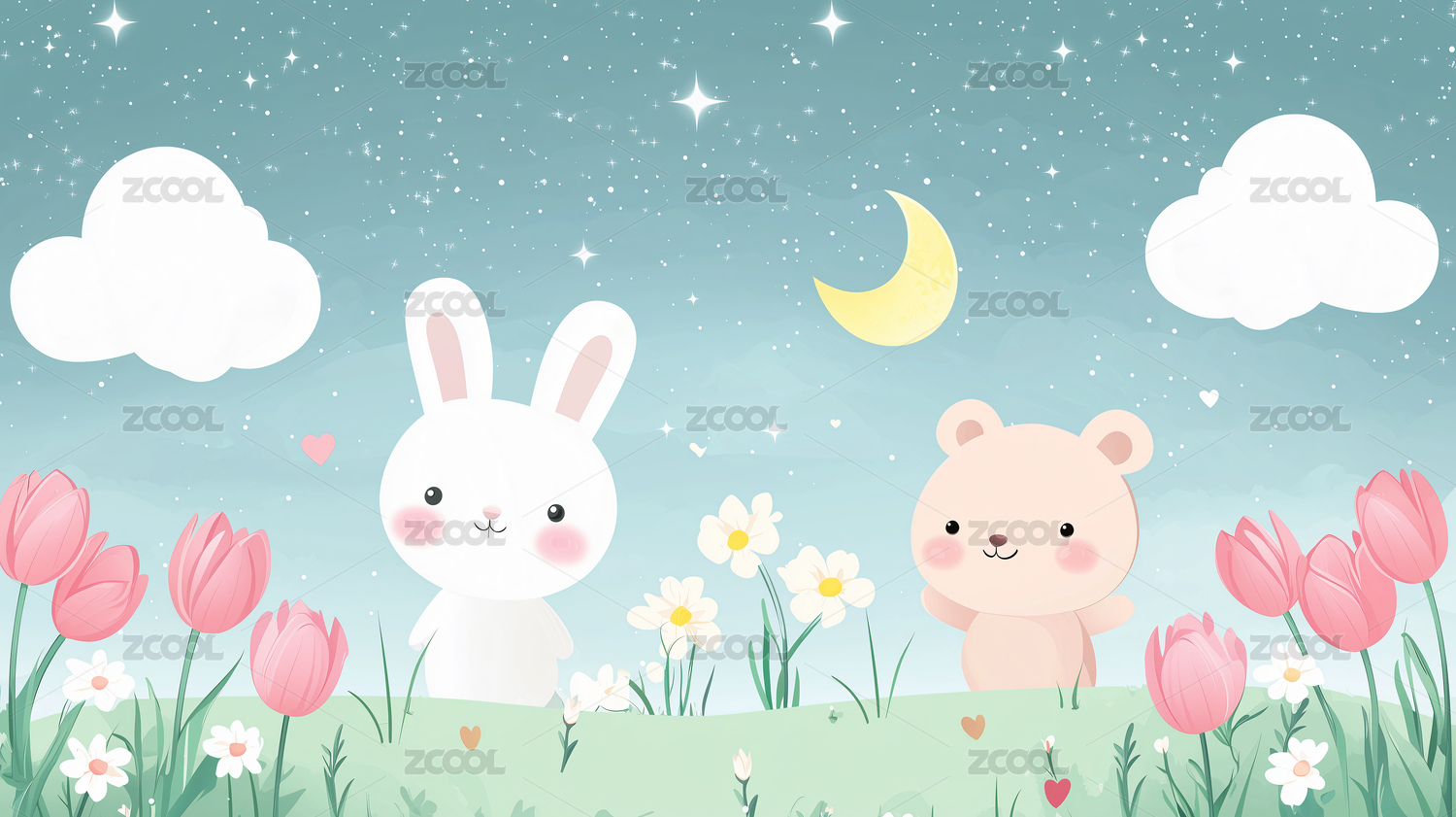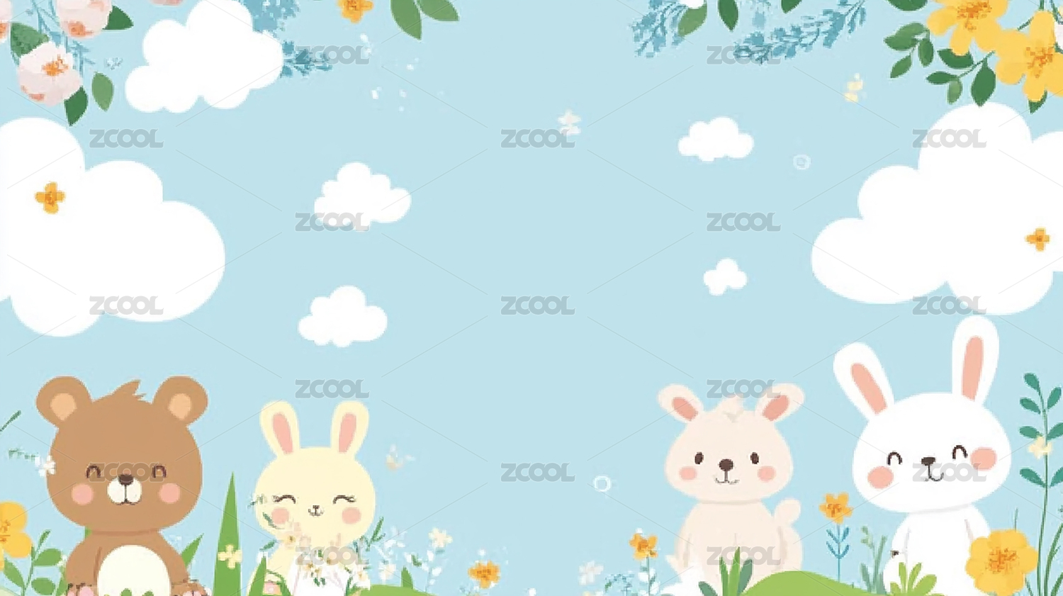 卡通动物花丛蓝天白云