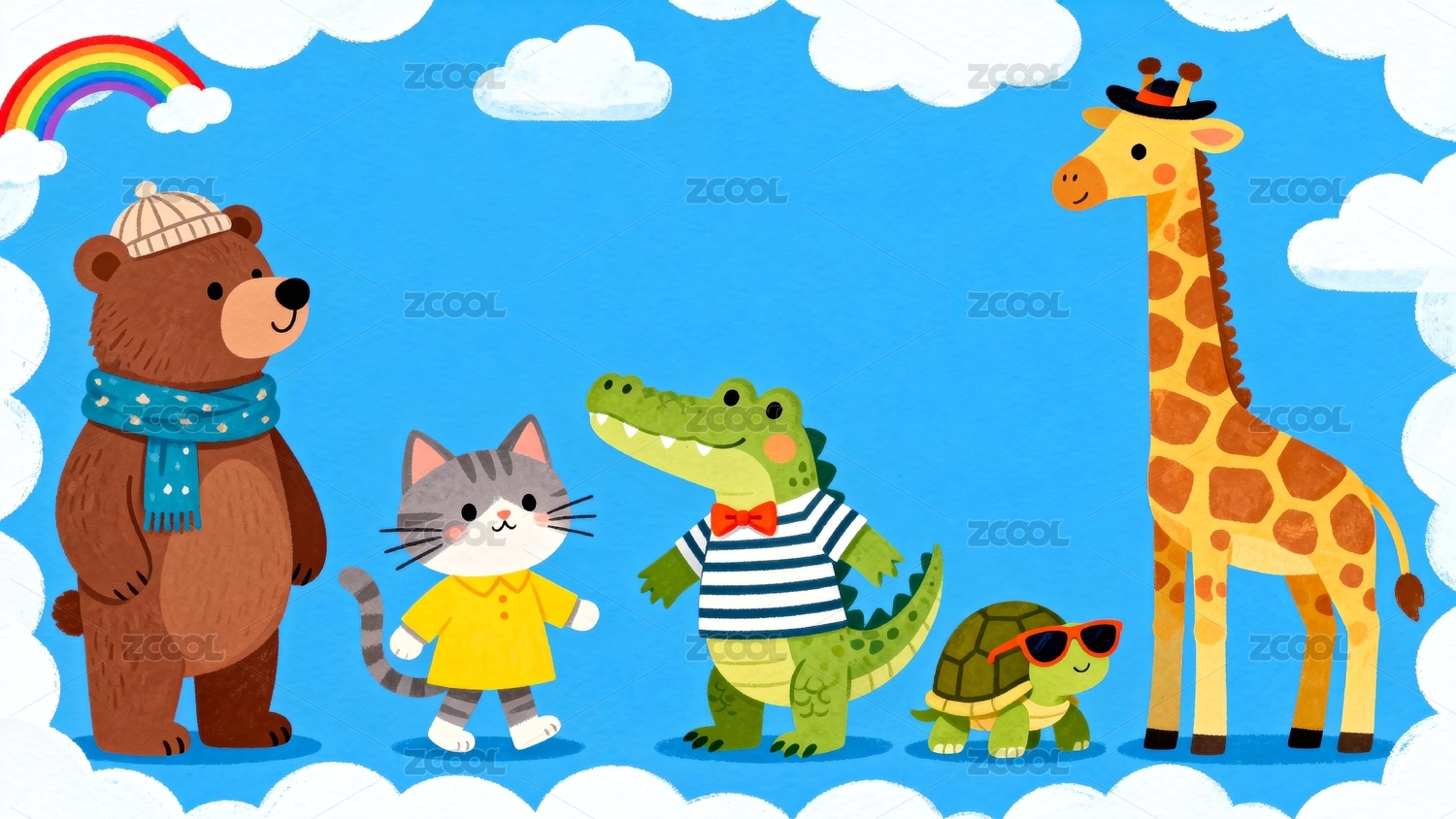 卡通动物欢乐聚会蓝天白云