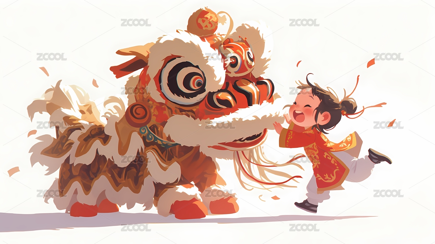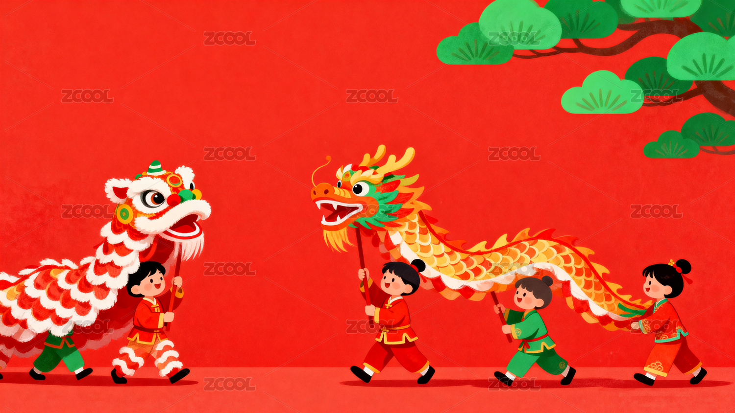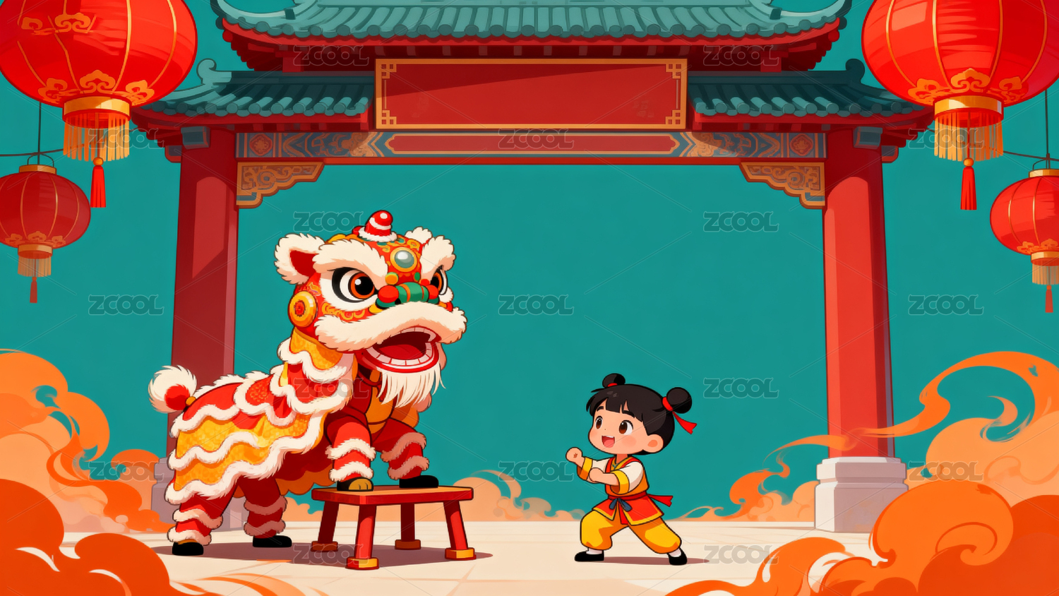 传统中国春节新年舞狮和男孩插画海报背景