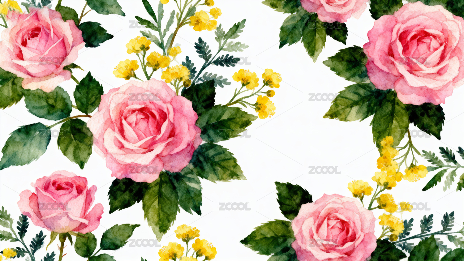 粉色玫瑰与黄色小花的水彩画