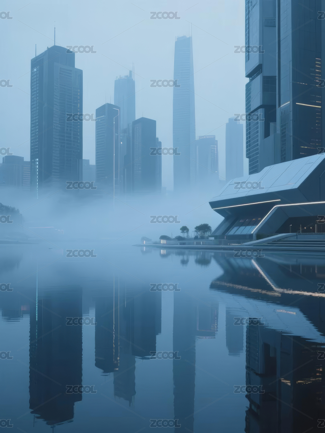 现代,建筑,冷色,城市,高楼,倒影,宁静,水面,天空,都市