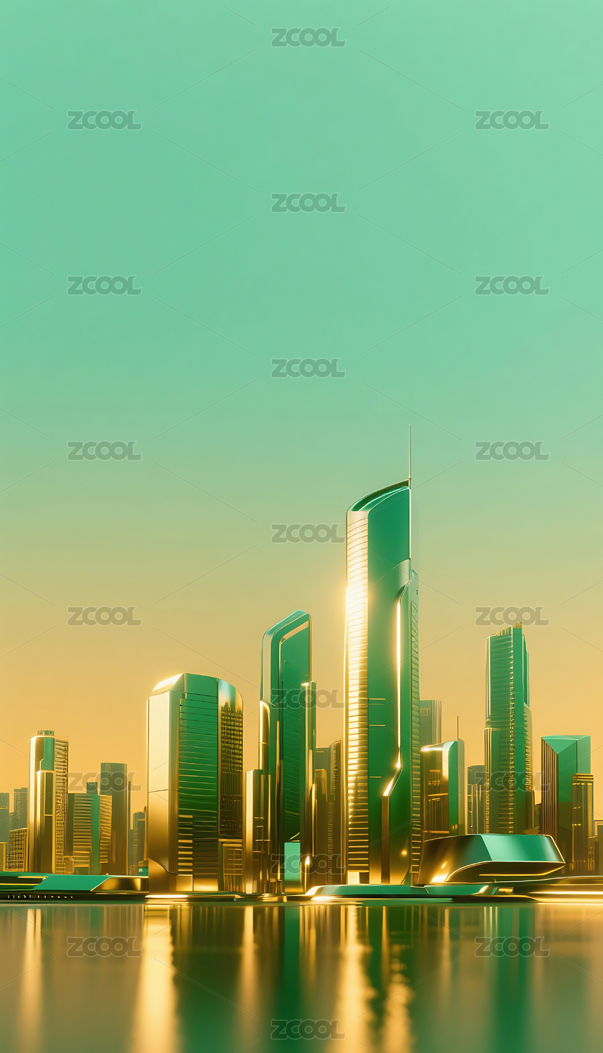 绿金色金属质感城市建筑天际线背景