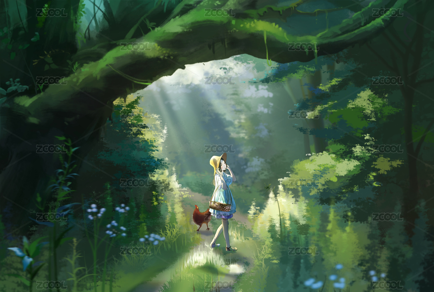 梦幻立绘森林中的少女抽象水彩油画