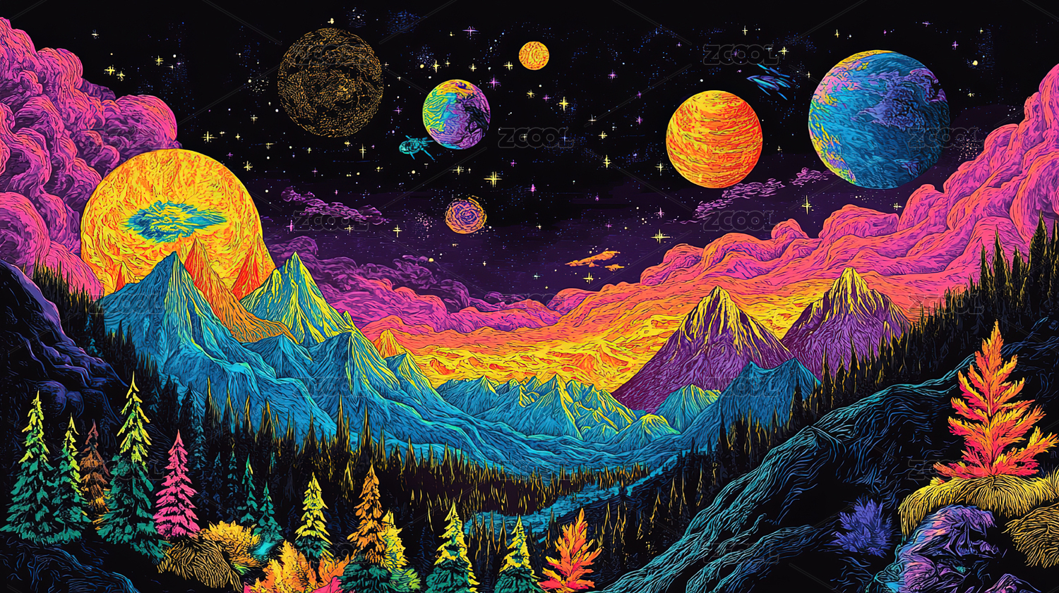 奇幻星空下的彩色森林