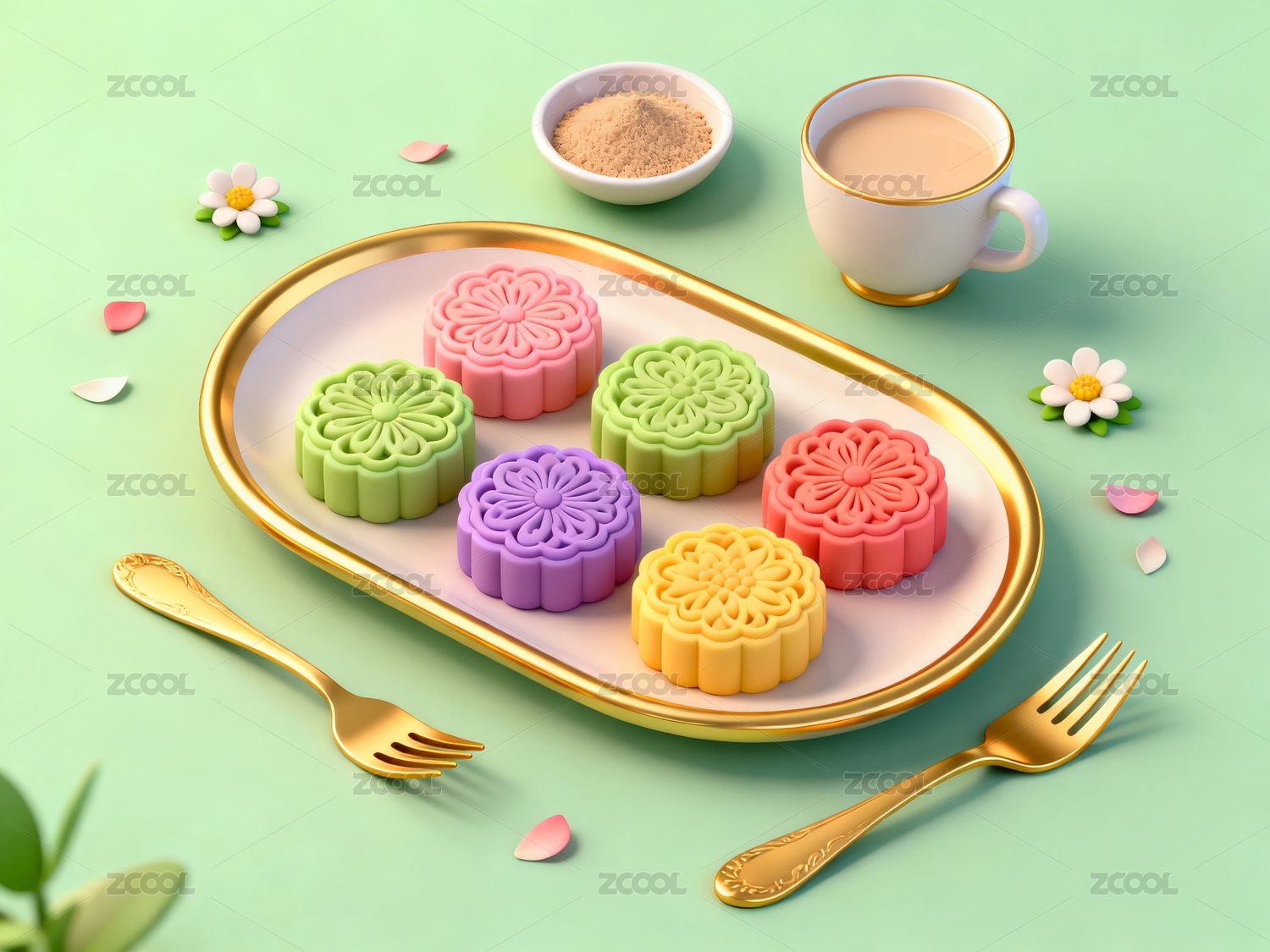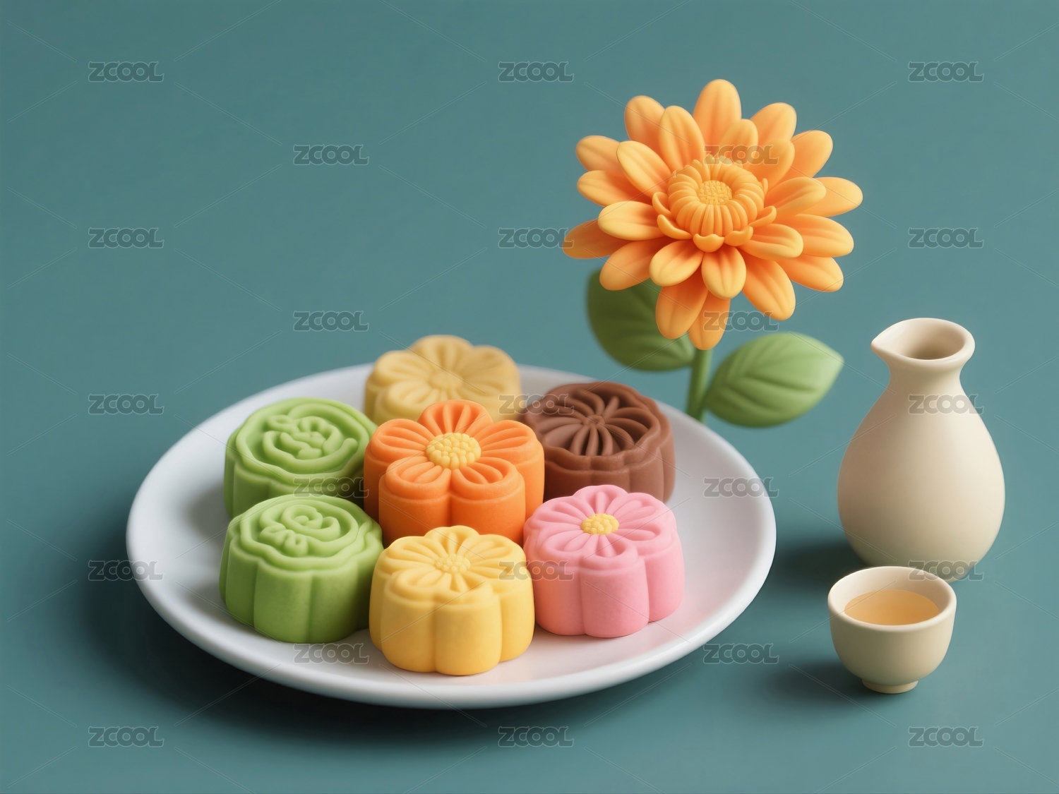 月饼,绿色,食物,糕点,摆件,白色,盘子,点缀,装饰,餐具