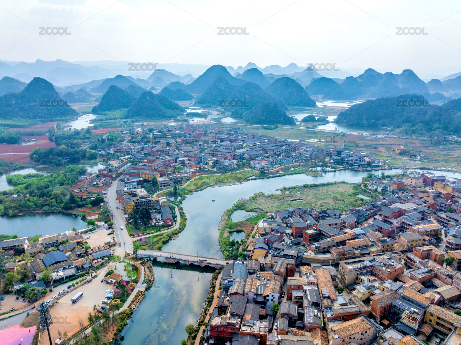 航拍云南普者黑小镇风光