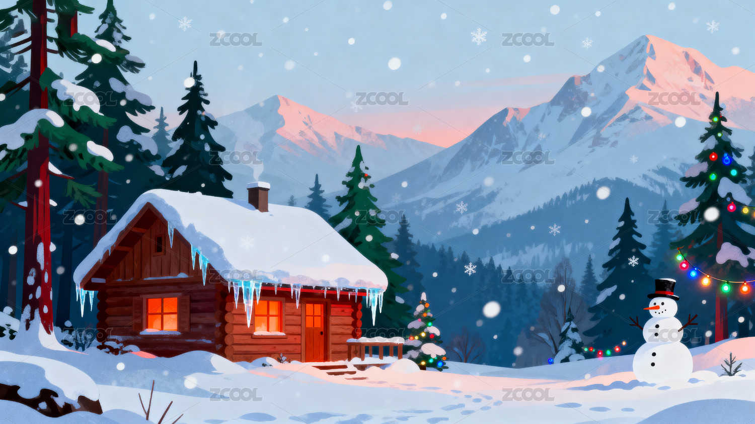 雪夜山林木屋与雪人