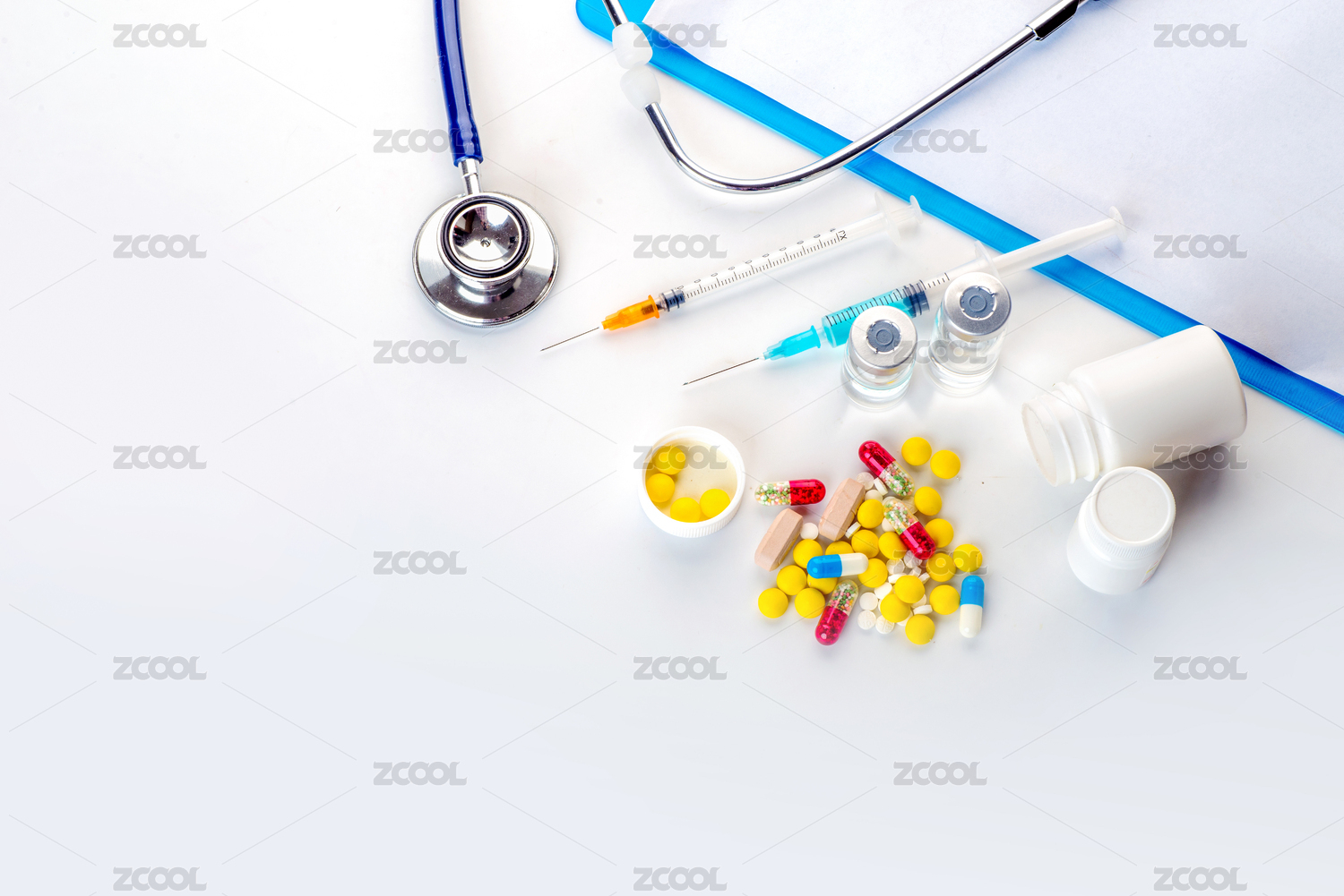 听诊器、疫苗和药品在白色背景上