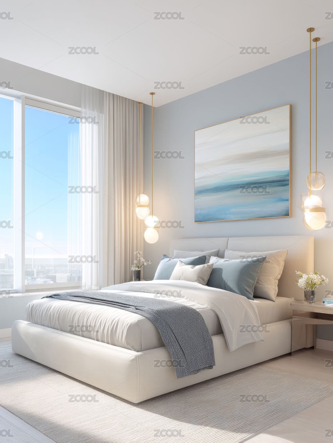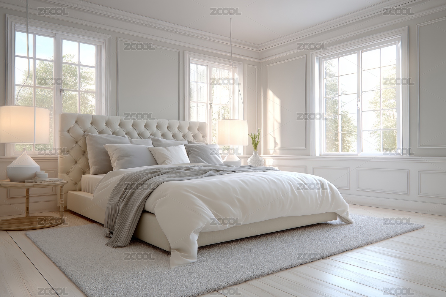现代简约卧室木质地板和家具灰色床品白色窗帘黑白照片装饰