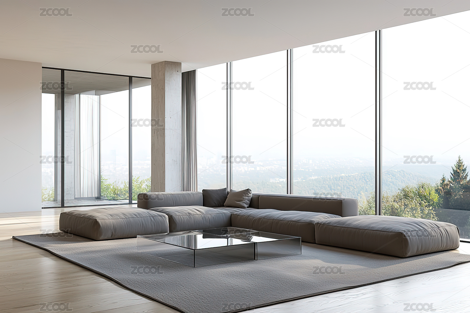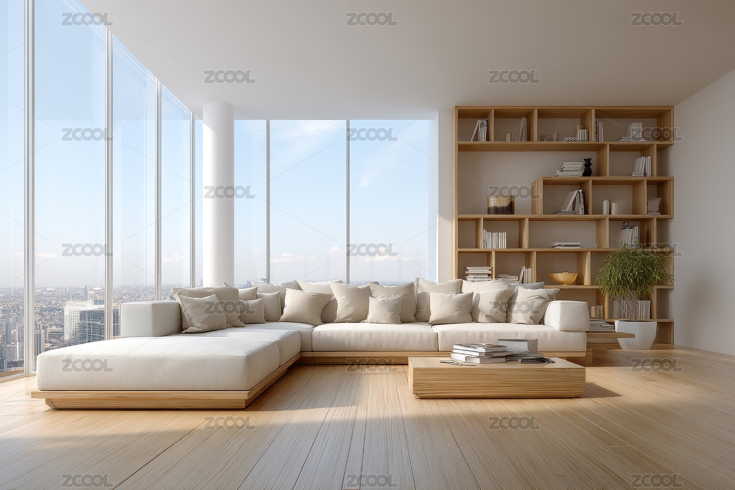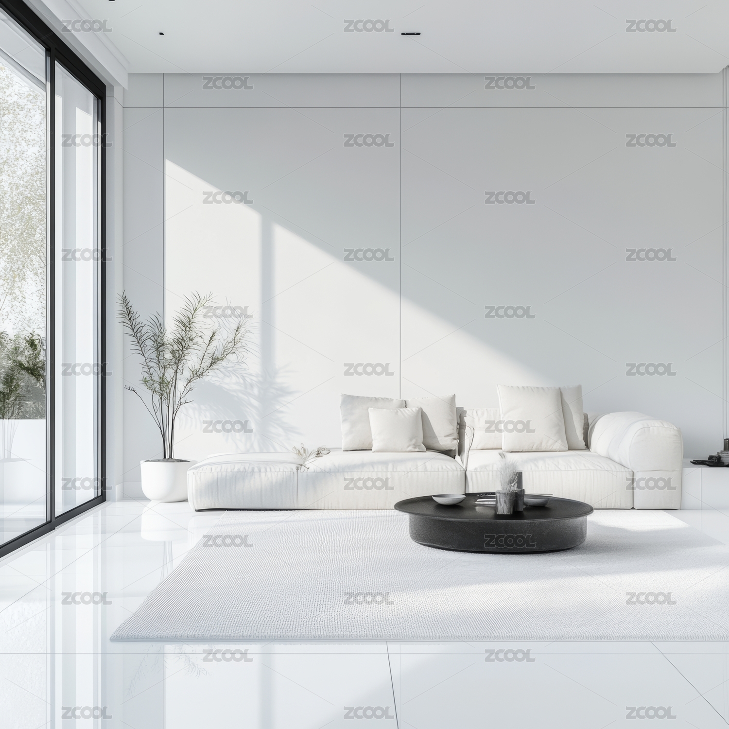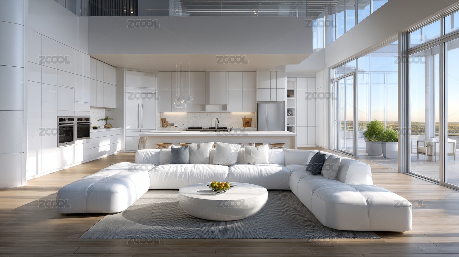 现代宽敞客厅与白色大沙发