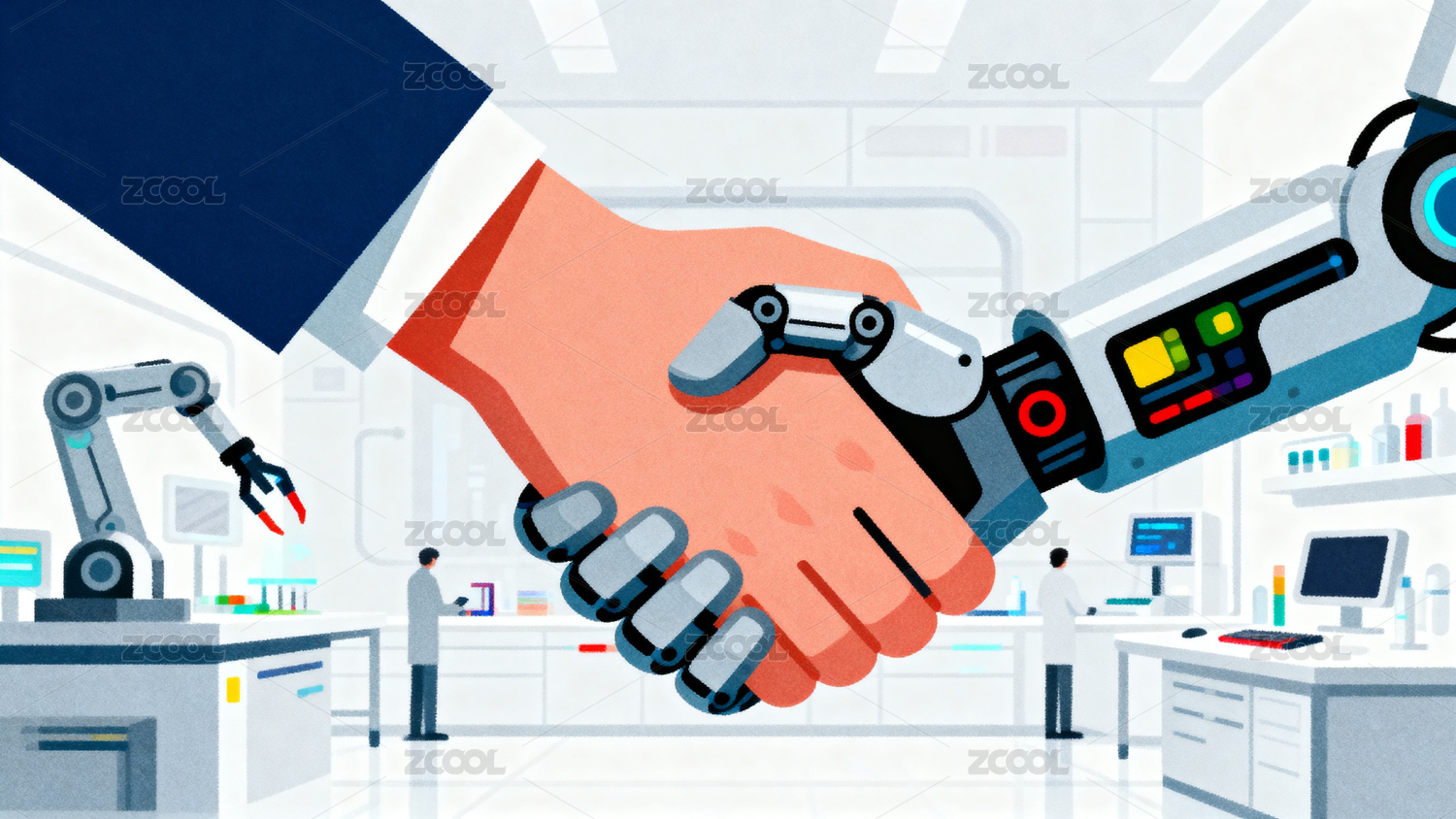 科学家与机器人握手象征科技合作