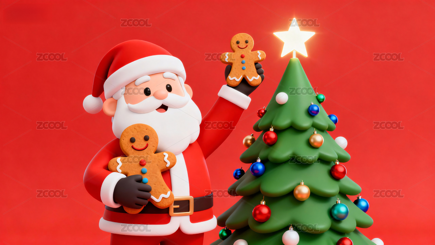 圣诞老人拿着姜饼人在圣诞树旁