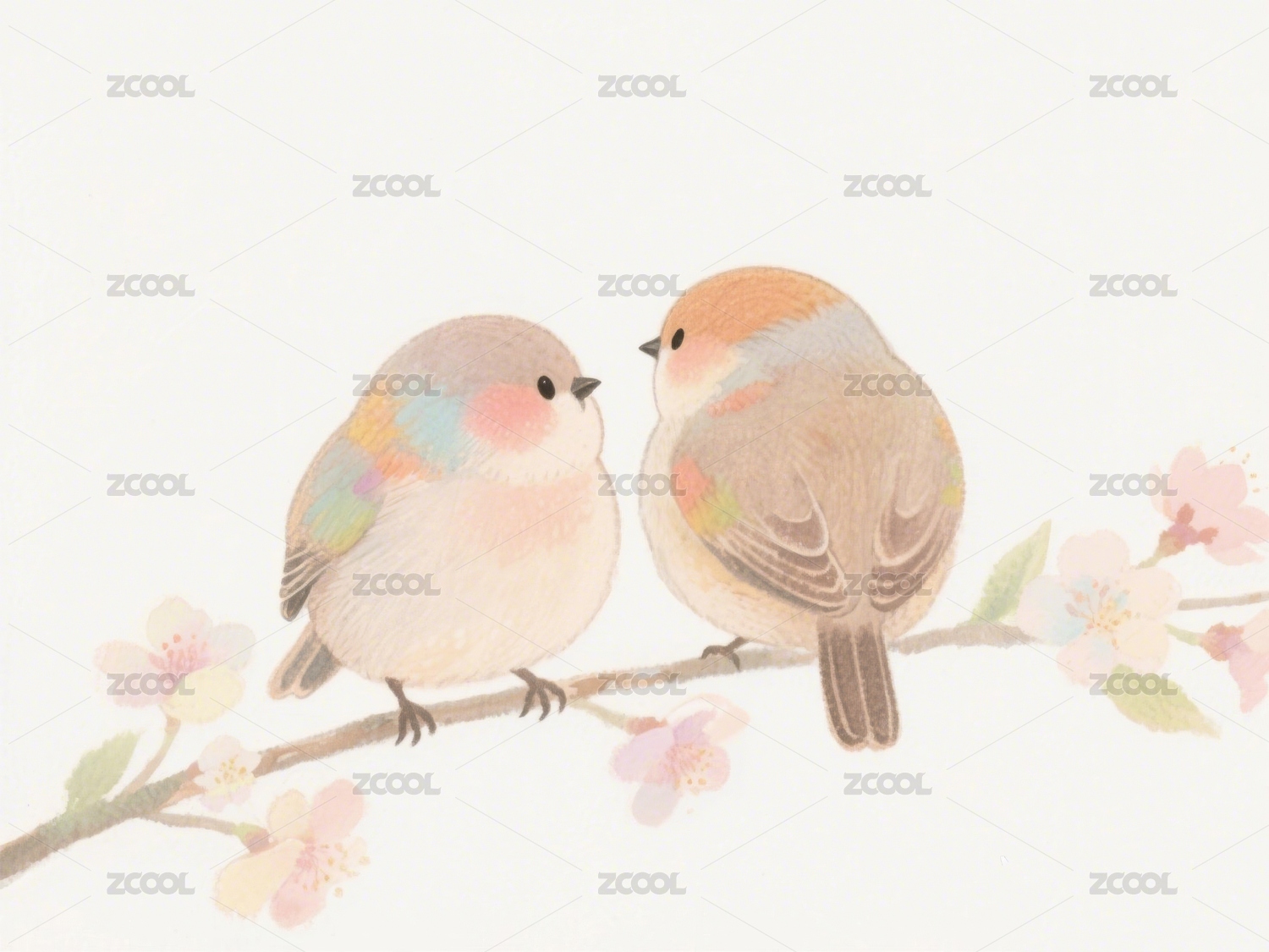枝头双飞鸟伴粉色花瓣