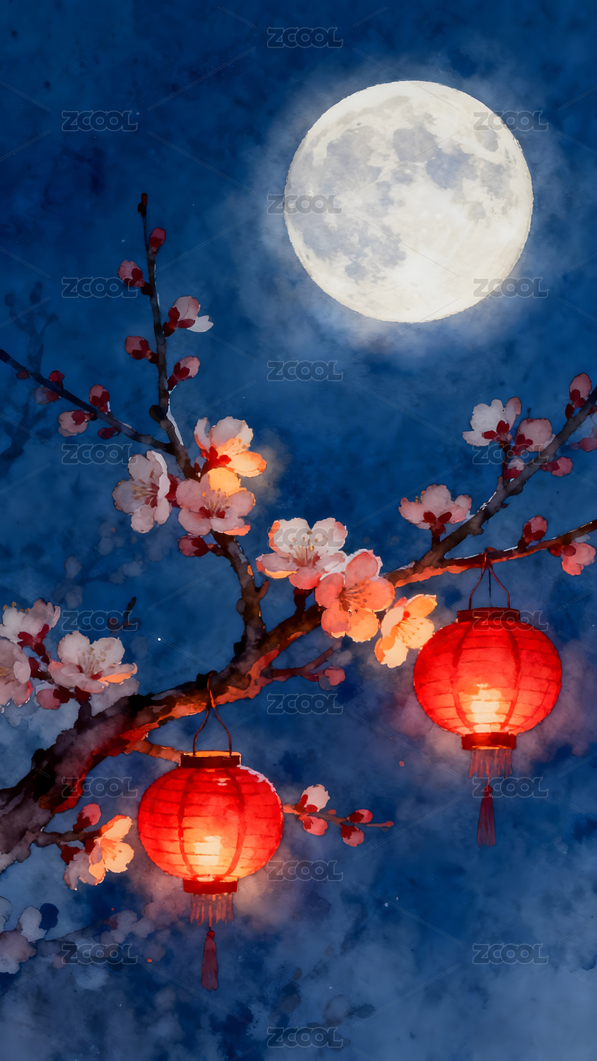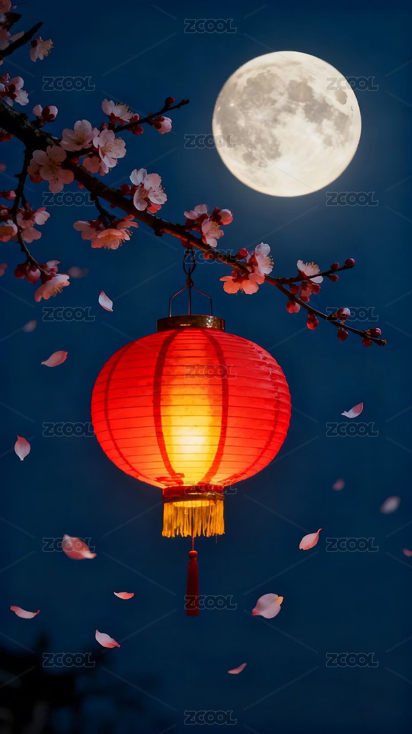 月亮,灯笼,花枝,花朵,夜空,花瓣,星空,暖光,暗蓝,背景