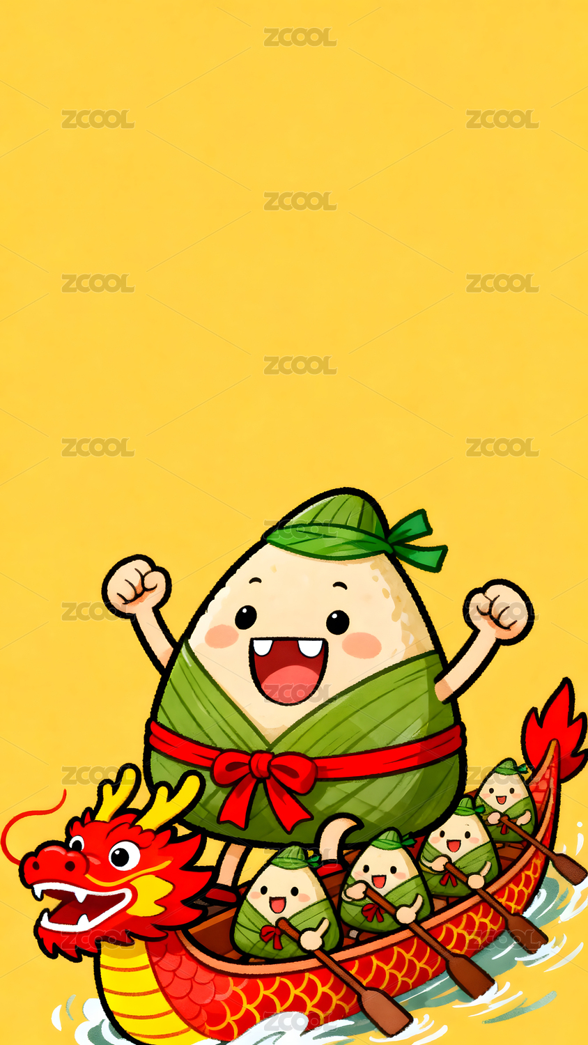 粽子,龙舟,龙头,船身,船桨,水花,笑脸,拳头,绿叶,黄色