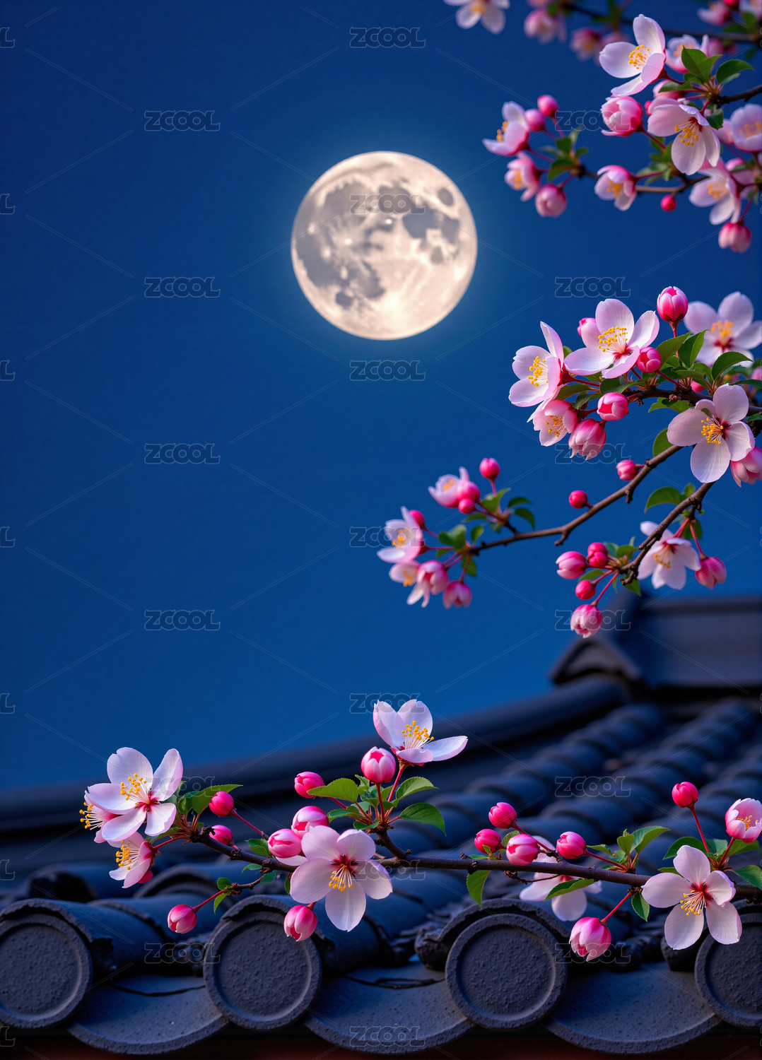 满月夜红灯笼映樱花枝头