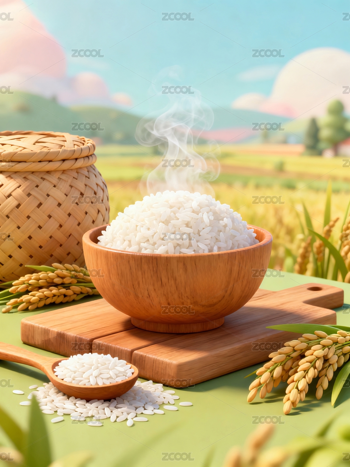 绿色农田稻穗和一碗白米饭三维插画