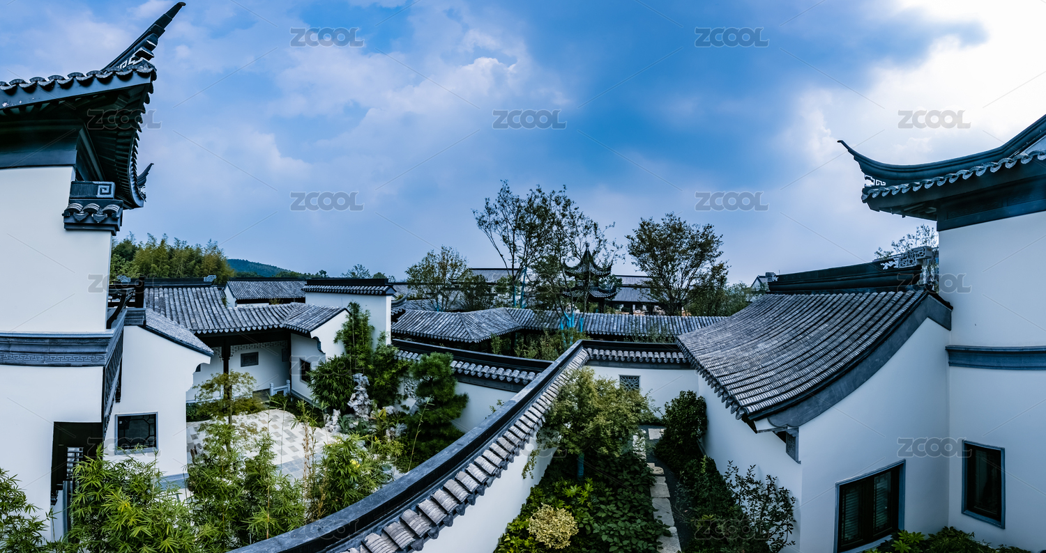 传统建筑,环境优美,白墙灰瓦,秋树红叶,庭院深深,屋顶飞檐,自然景观,宁静氛围,东方美学,晨雾缭绕