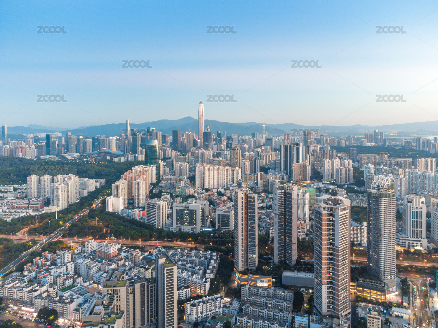 鸟瞰中国广东省深圳城市天际线建筑群高楼大厦黄昏风光