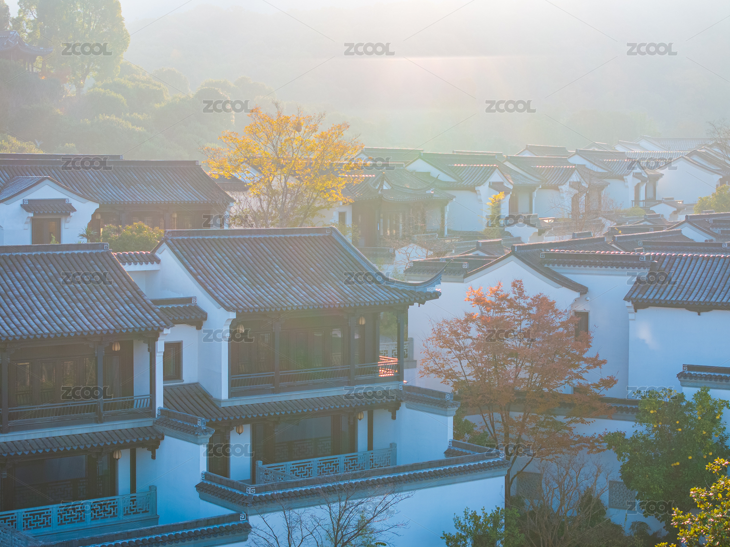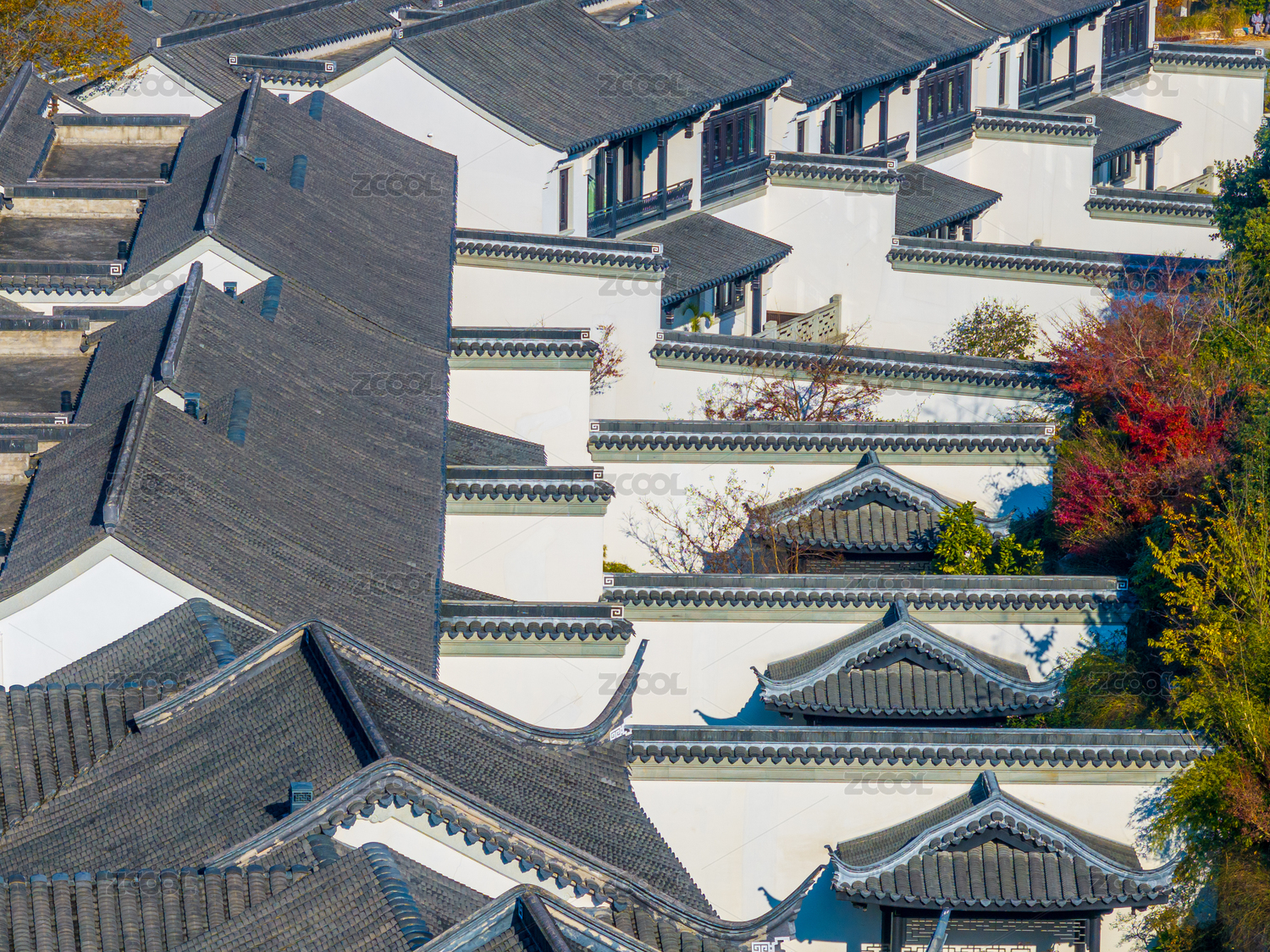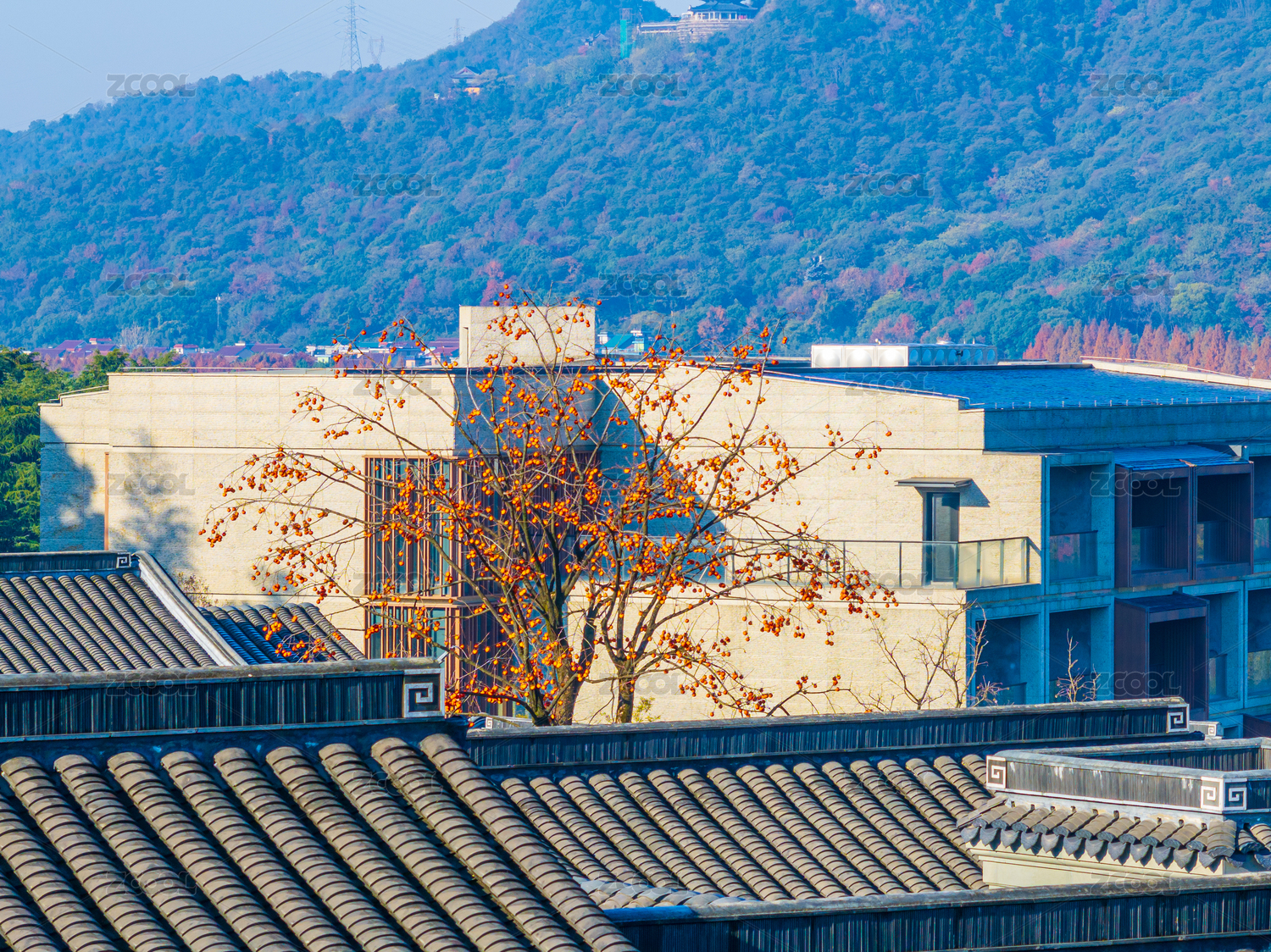 传统建筑,屋顶瓦片,古典风格,城市景观,现代楼房,蓝色外墙,树木落叶,现代设计,秋日景色,建筑对比