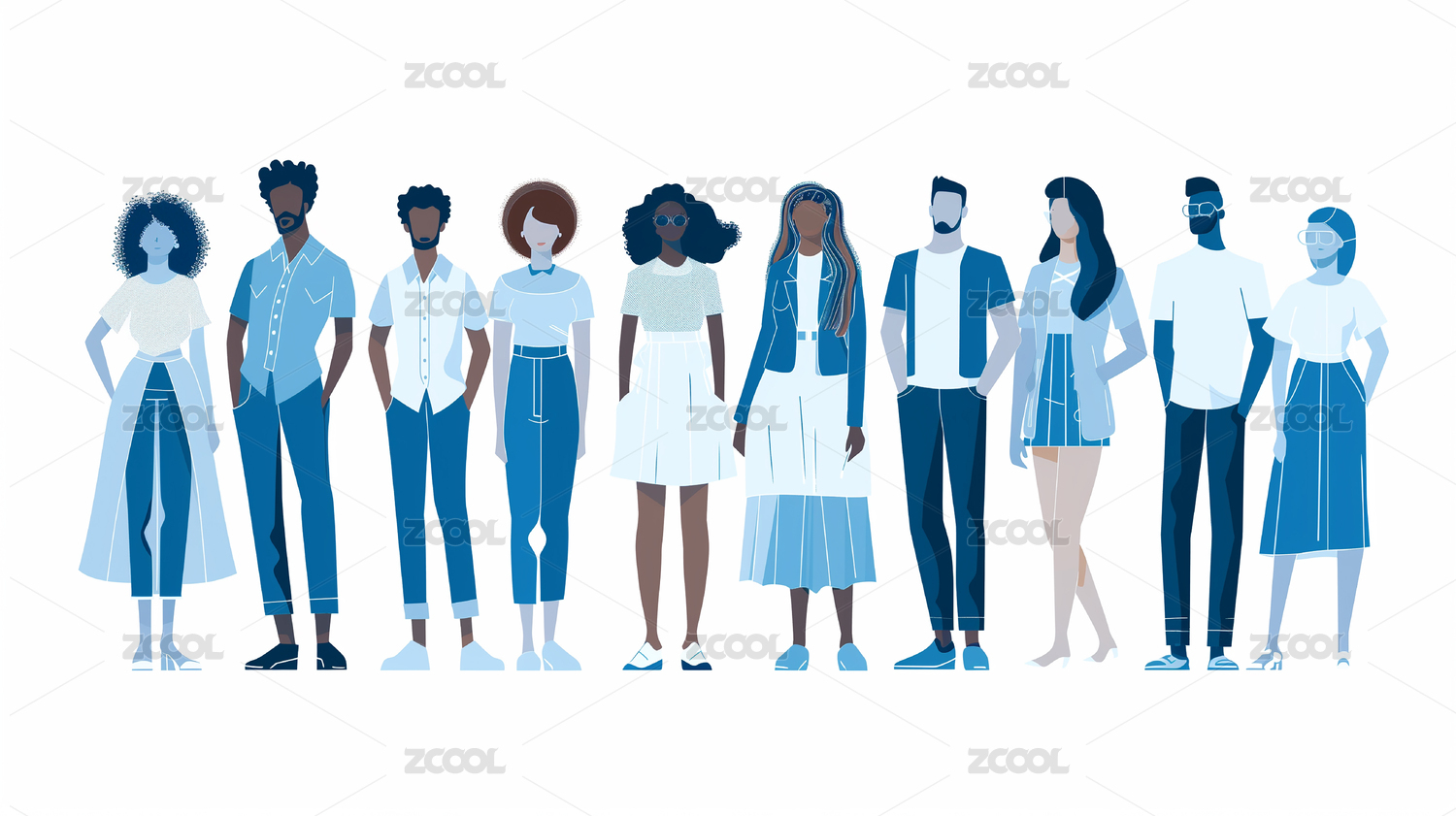 一群不同皮肤不同种族的模特蓝色服装插画秀