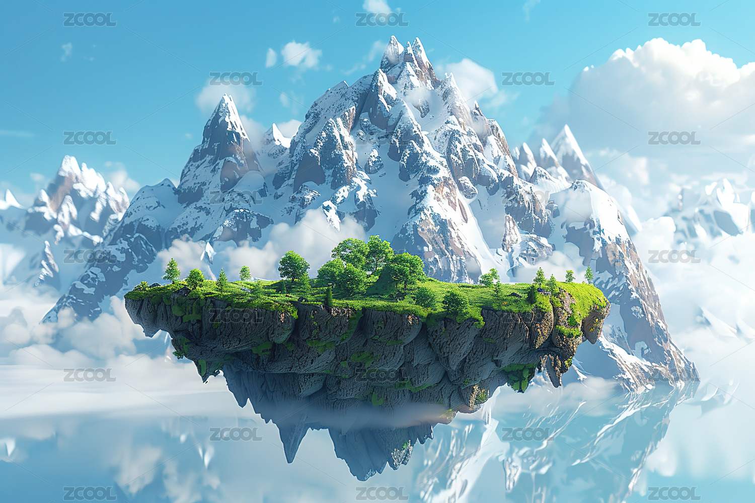 蓝天,山峰,悬浮,白云,绿树,溪流,岛屿,岩石,草丛