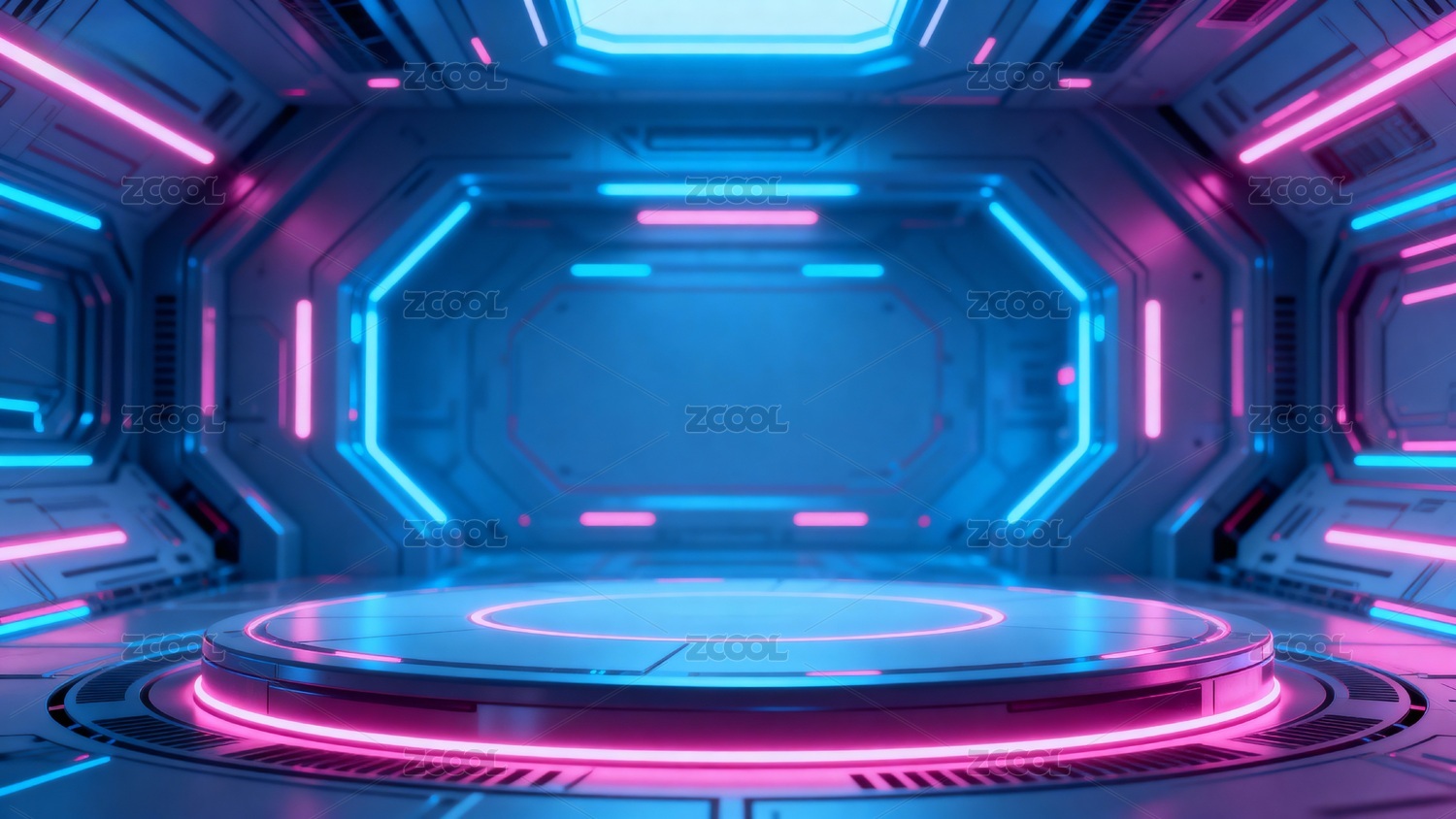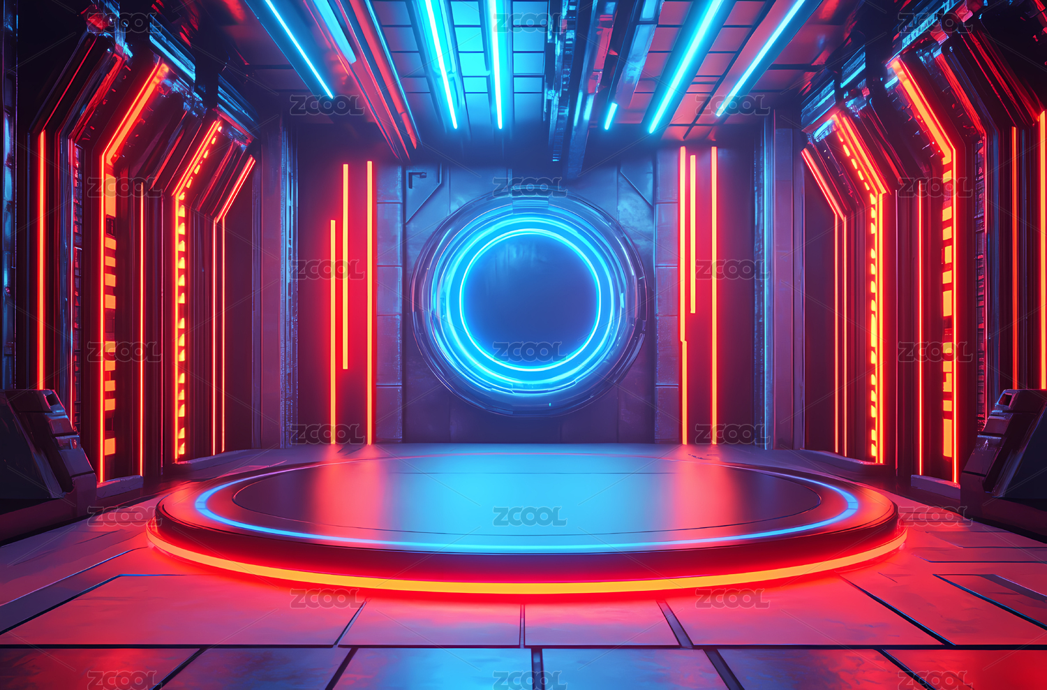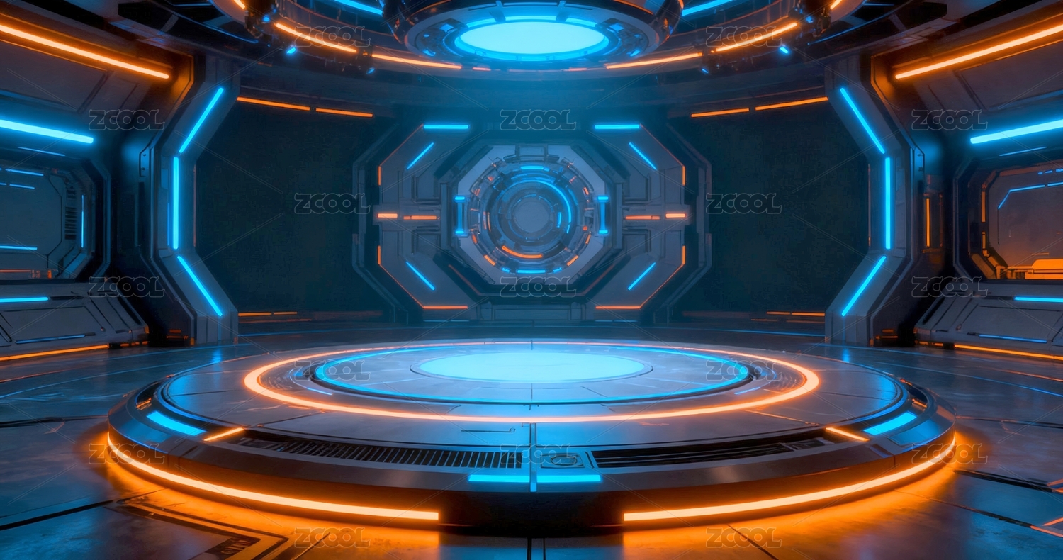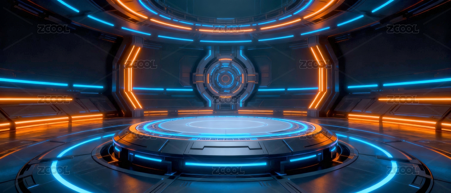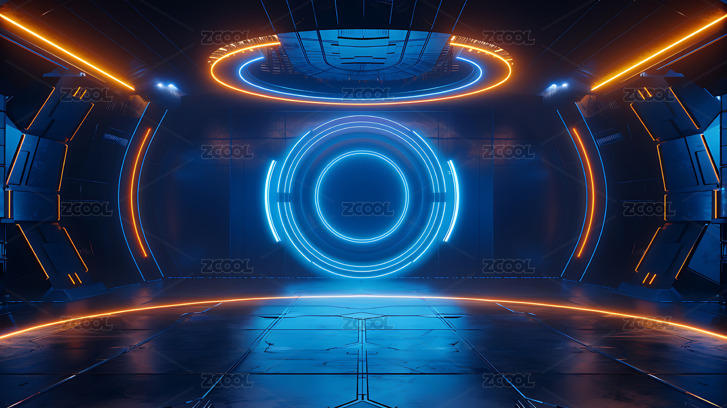 蓝橙霓虹圆形平台走廊