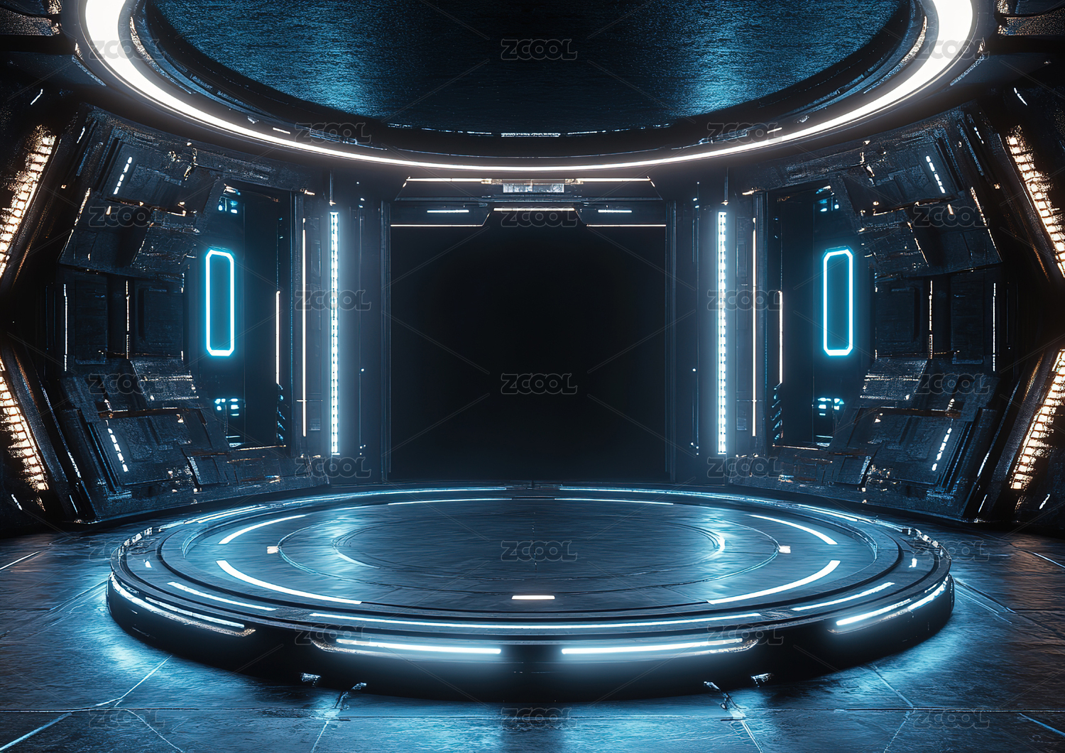 蓝色科技感未来场景,圆形展台中央发光