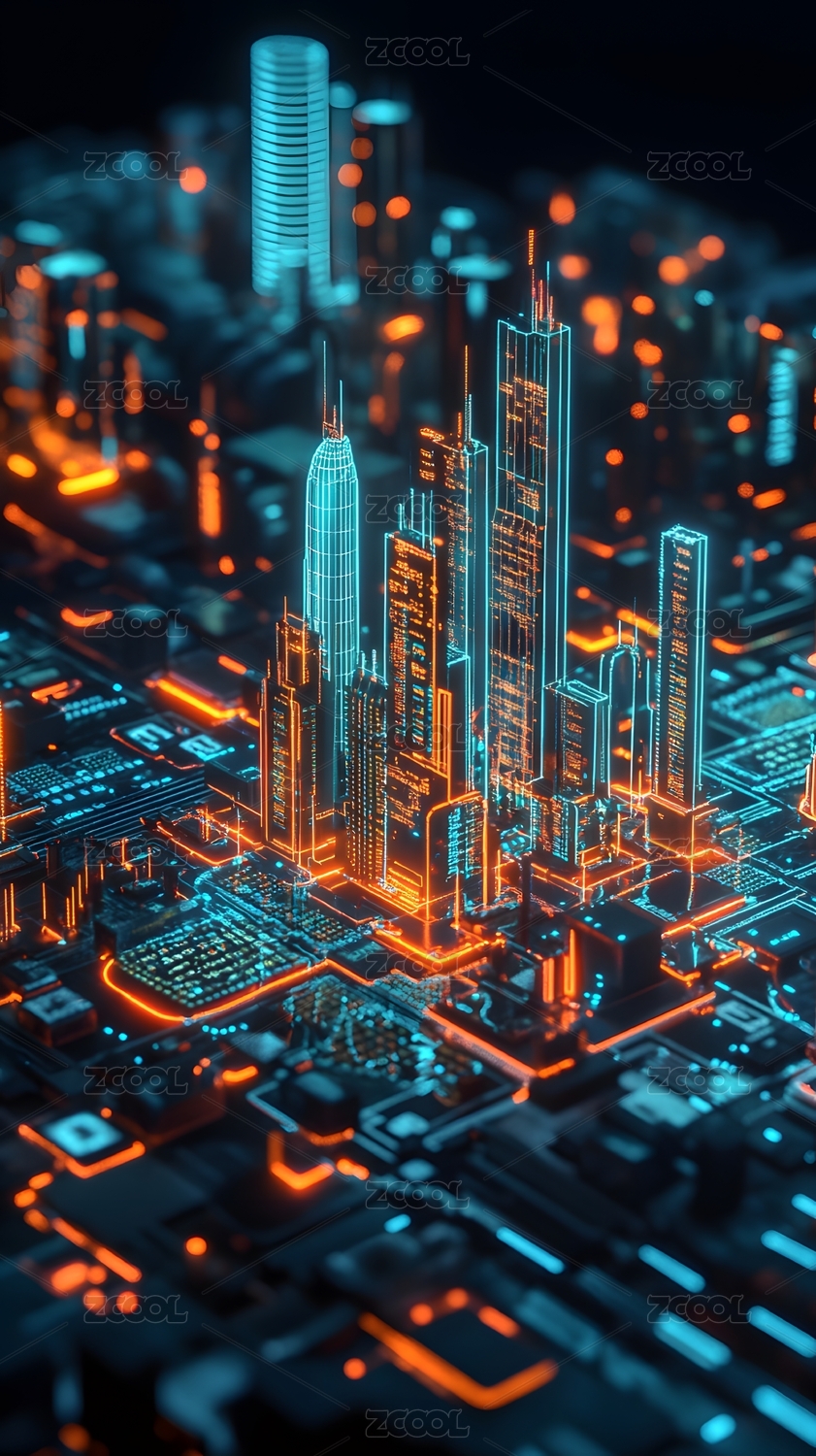 航拍科技未来蓝色发光城市建筑3D卡通立体