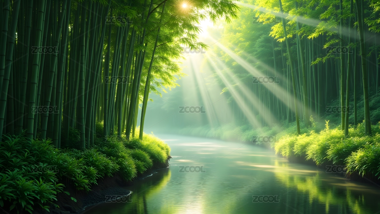 竹林,水面,倒影,光球,雾气,拱门,绿叶,阳光,神秘