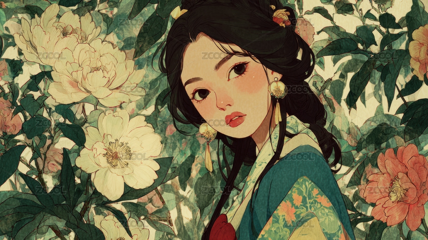 背景,女子,长发,古装,红耳环,竹叶,清雅,表情