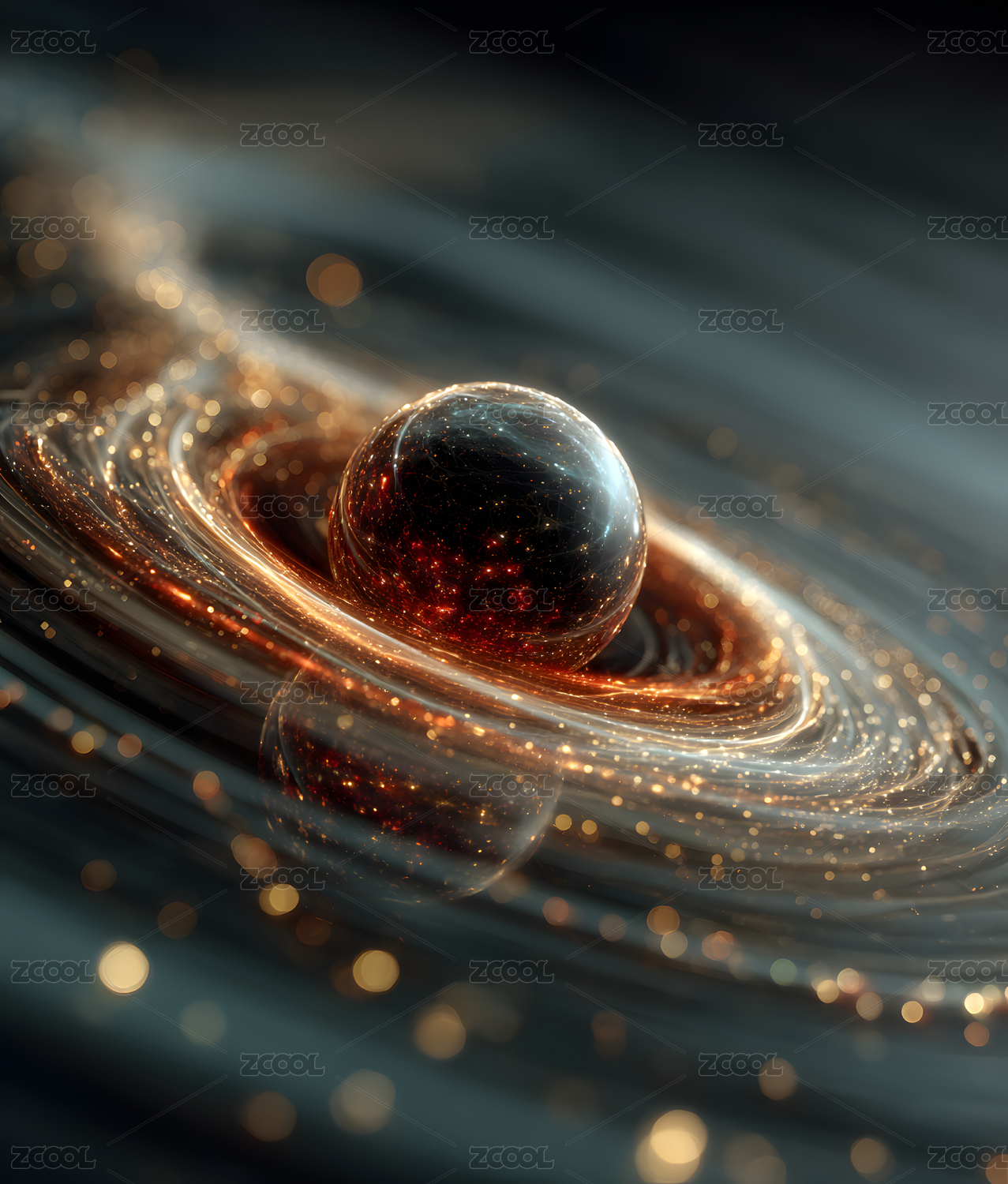 金色球体悬浮于漩涡状抽象纹理之中
