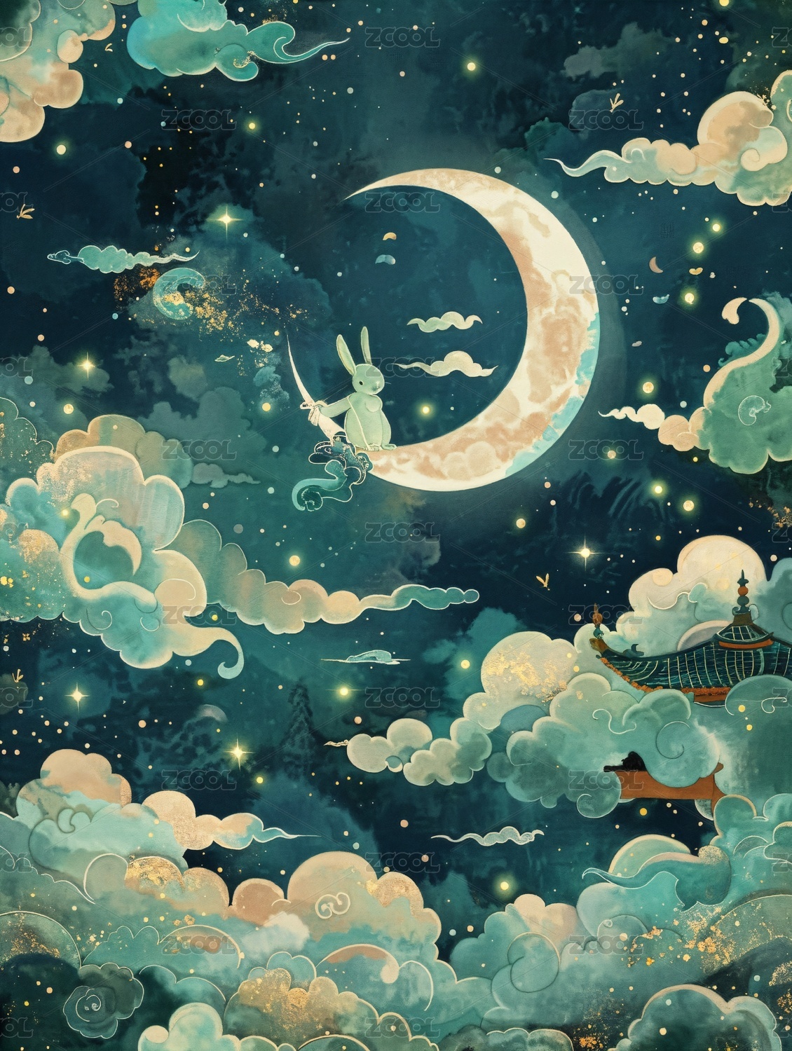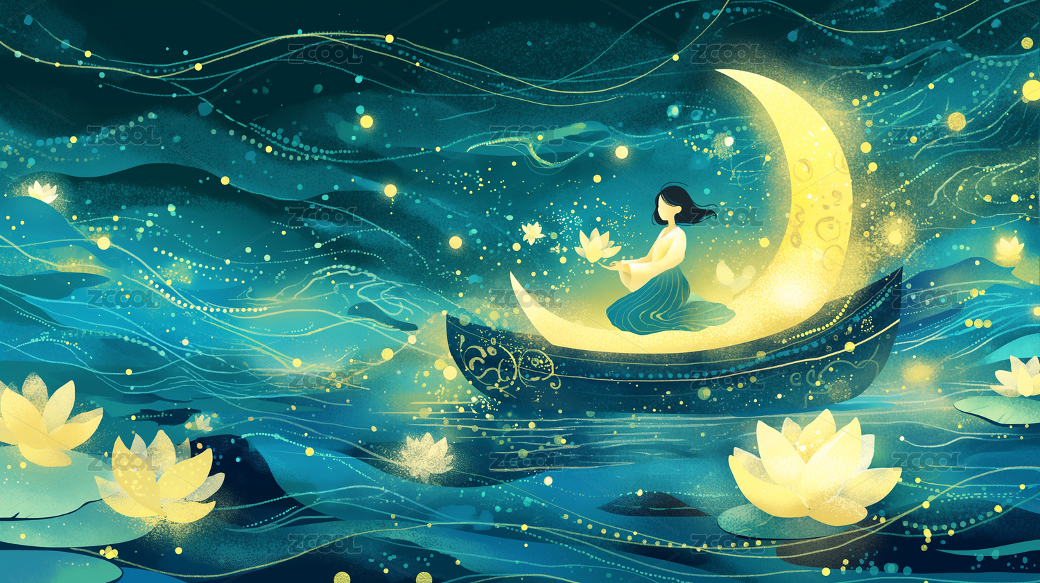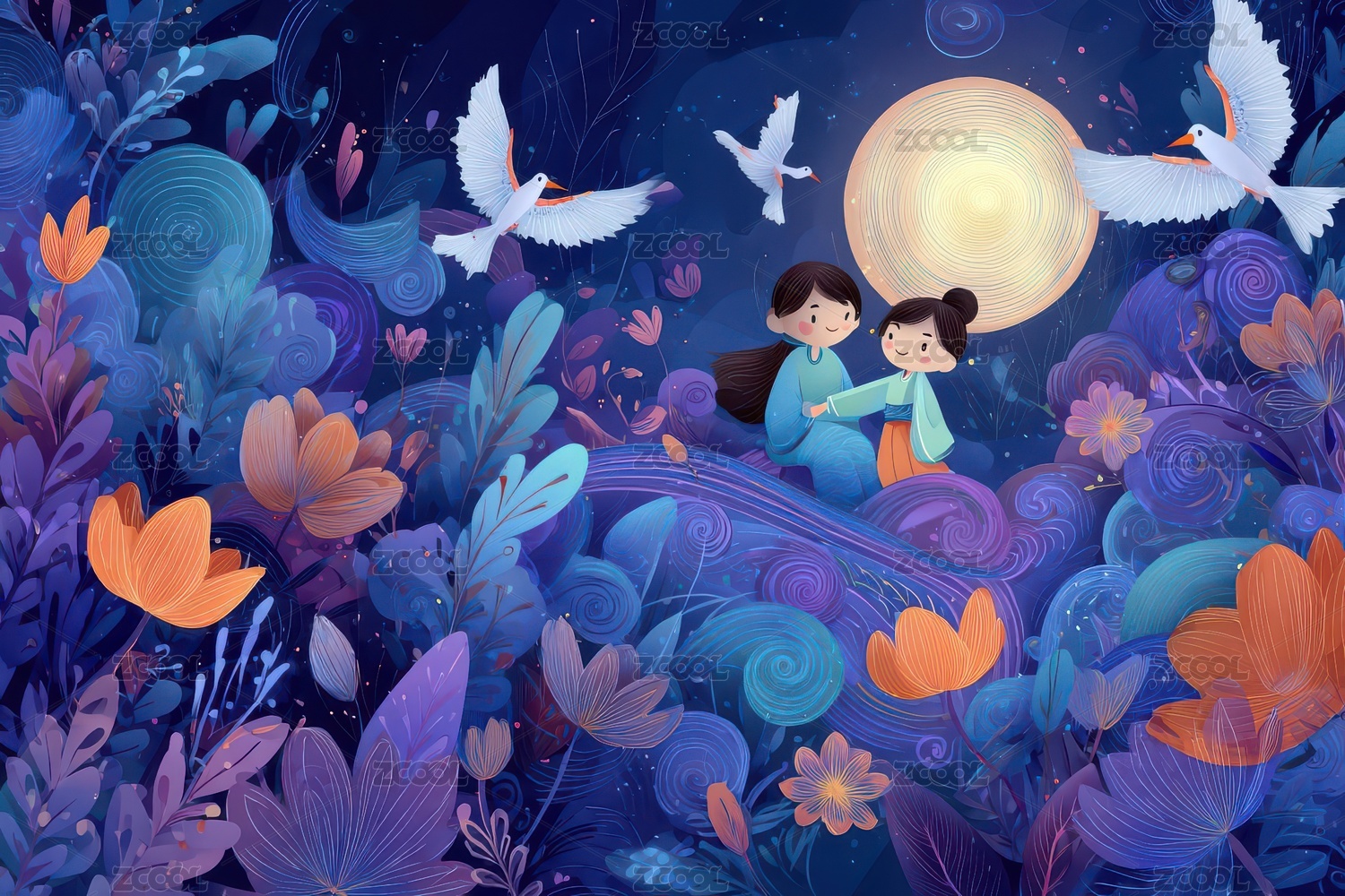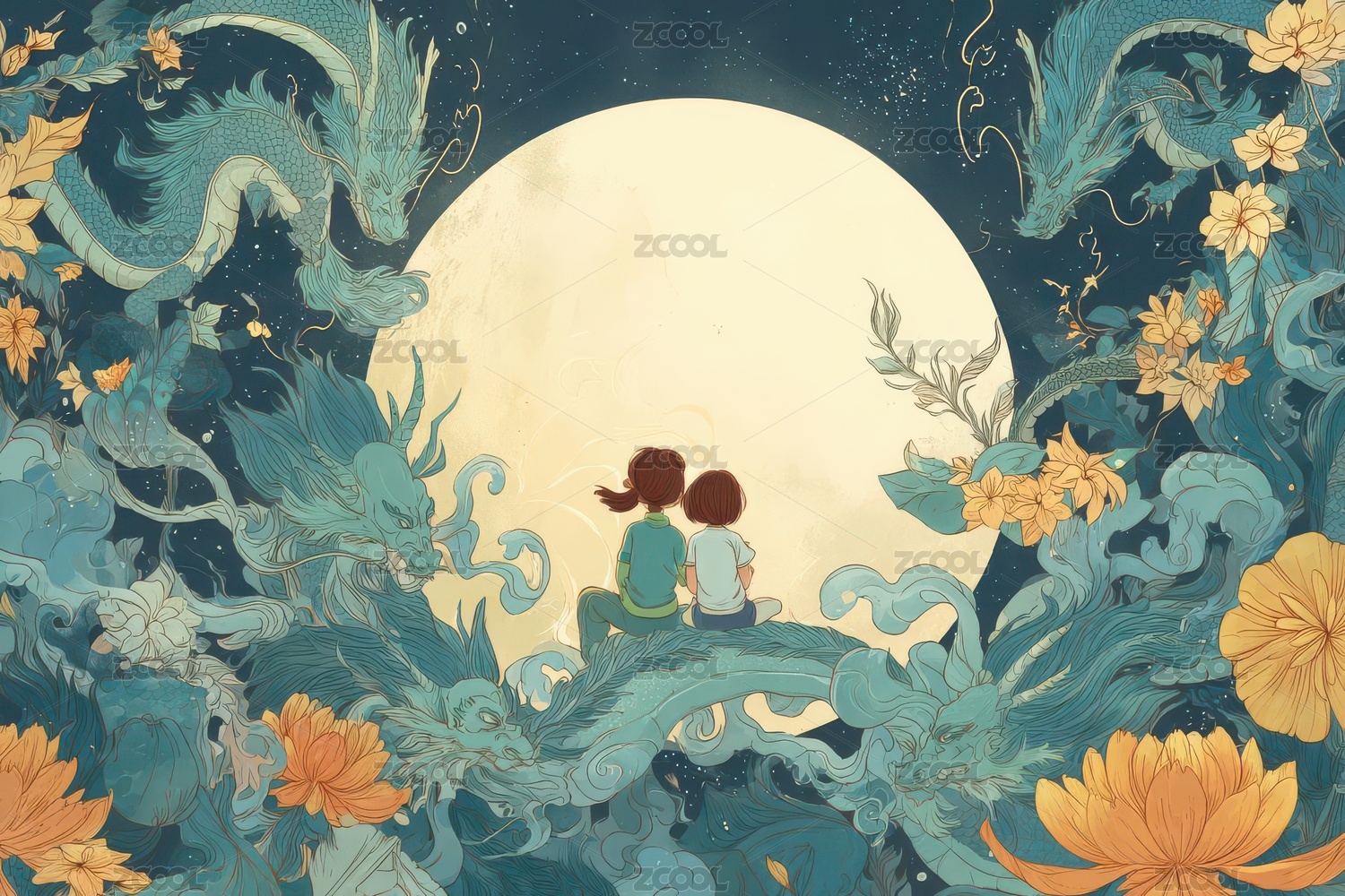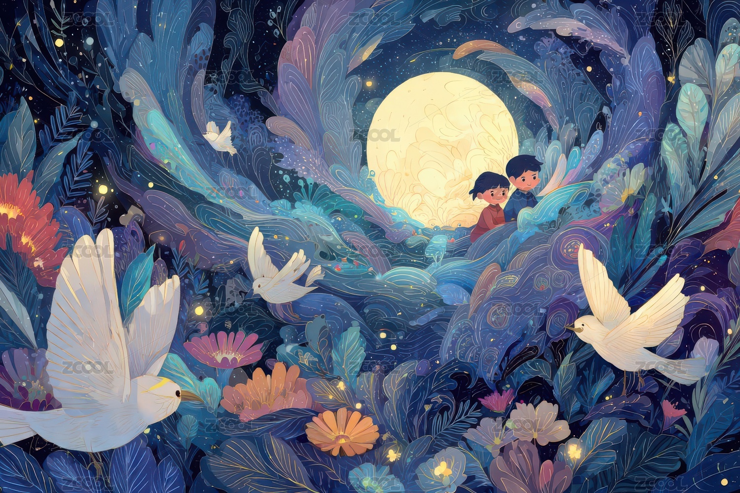 月亮,夜晚,花朵,神秘,森林,祖孙,龙蛇,和谐