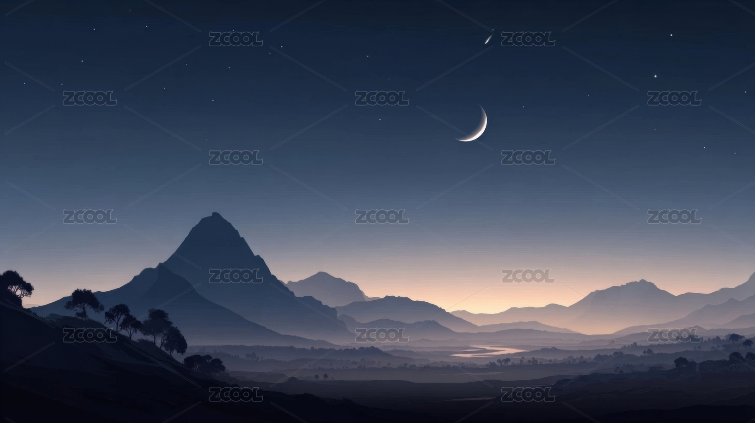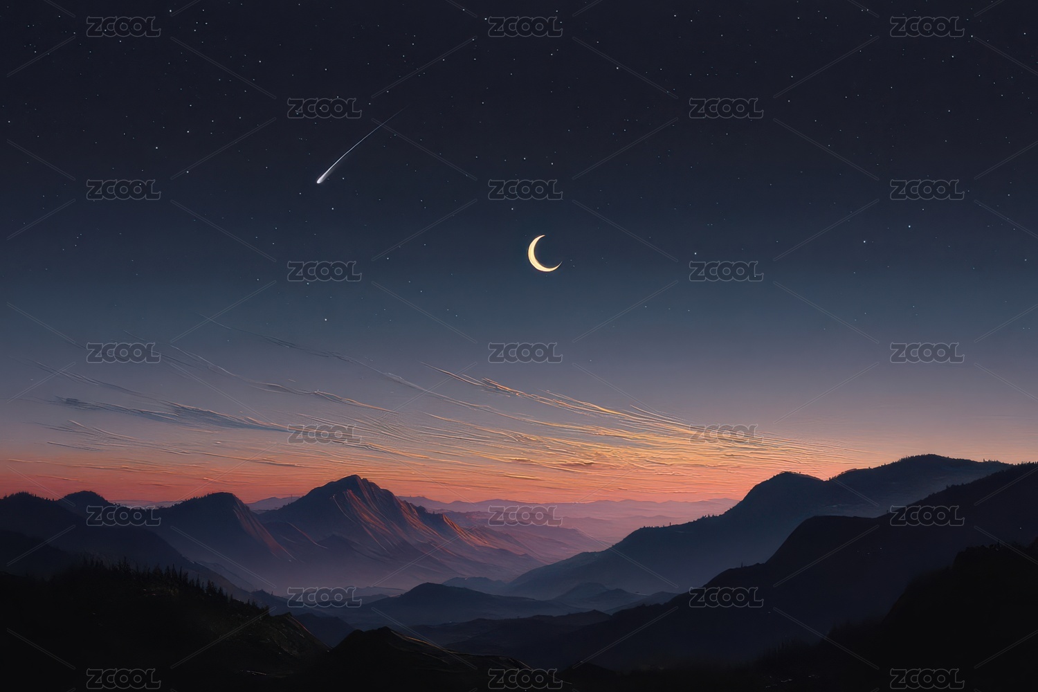 星空下的山峦与新月