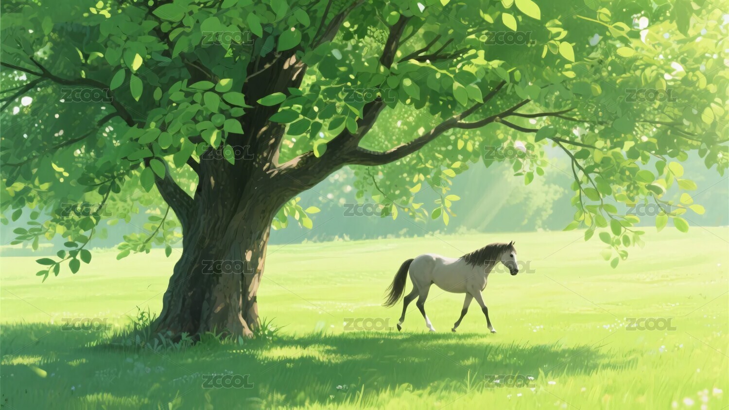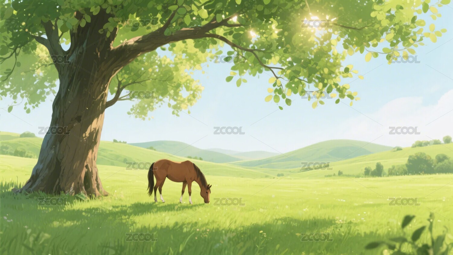 草原,白马,绿树,蓝天,白云,插画,自然,风景,花草,田园