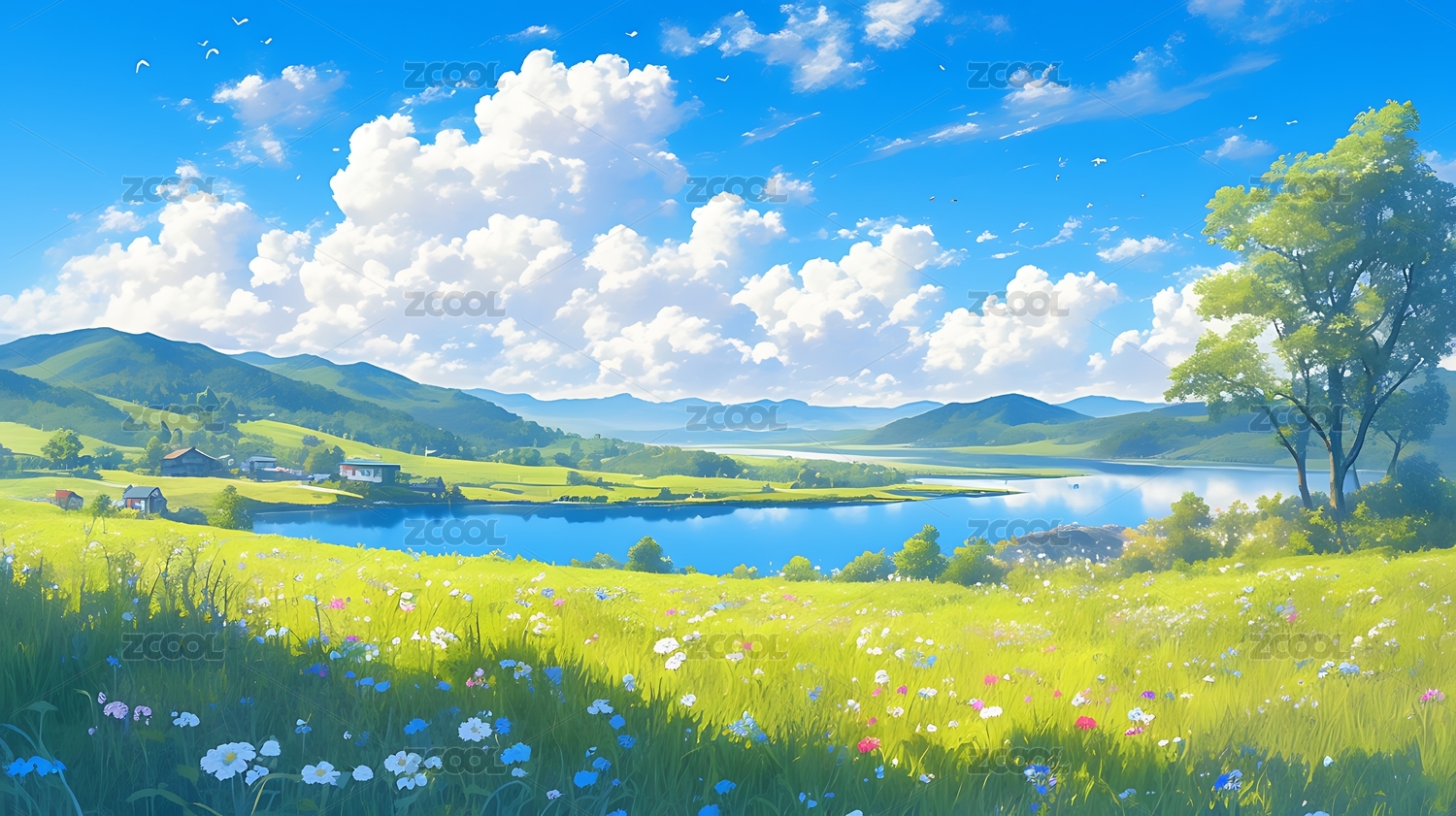 蓝天白云草地湖泊户外场景壁纸