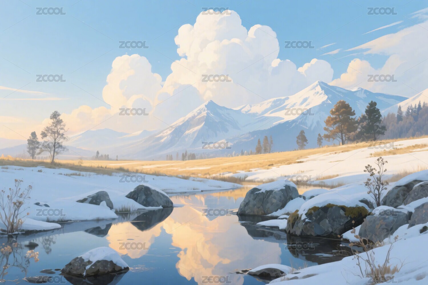 冬季大雪节气插画,雪景中的冬天河流场景插