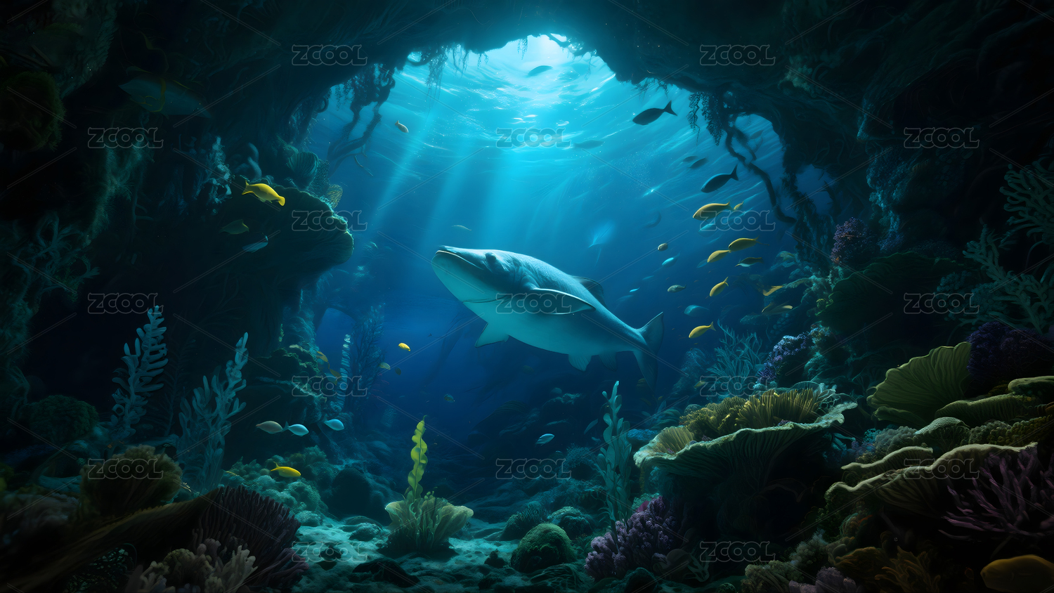 深海鲨鱼穿梭岩石间