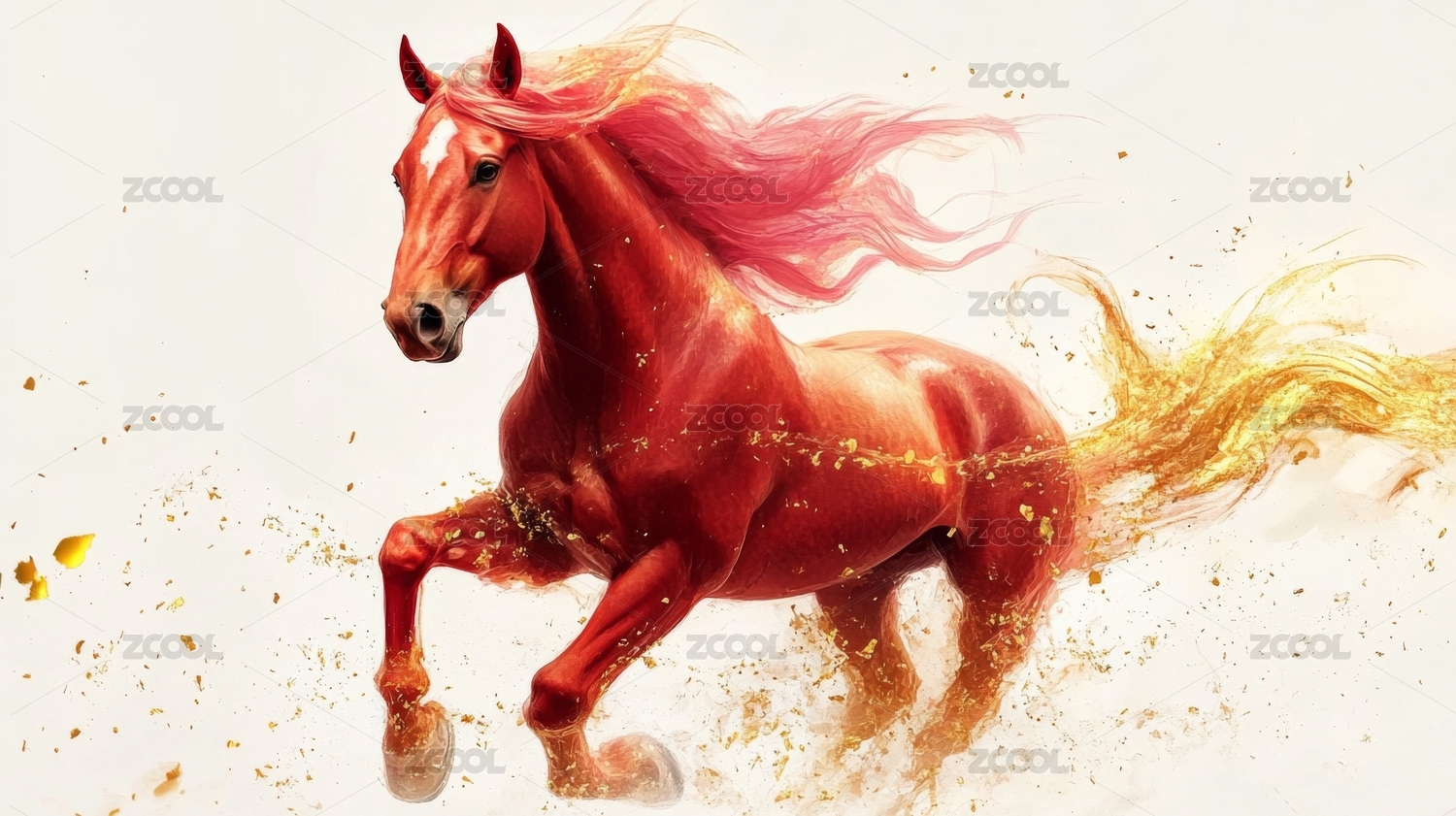 金色骏马奔腾于红色背景之上