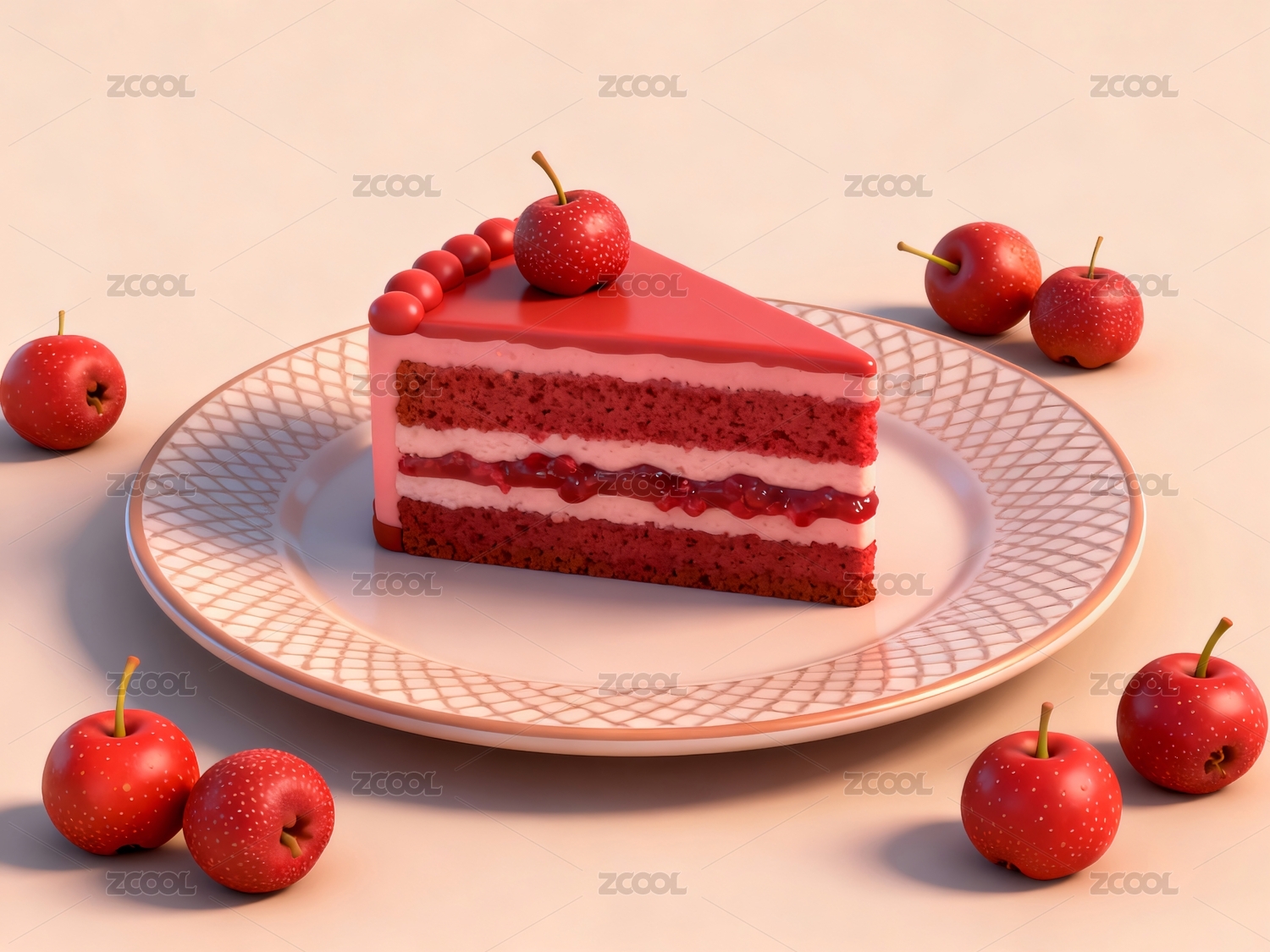 草莓蛋糕切块盘中搭配苹果